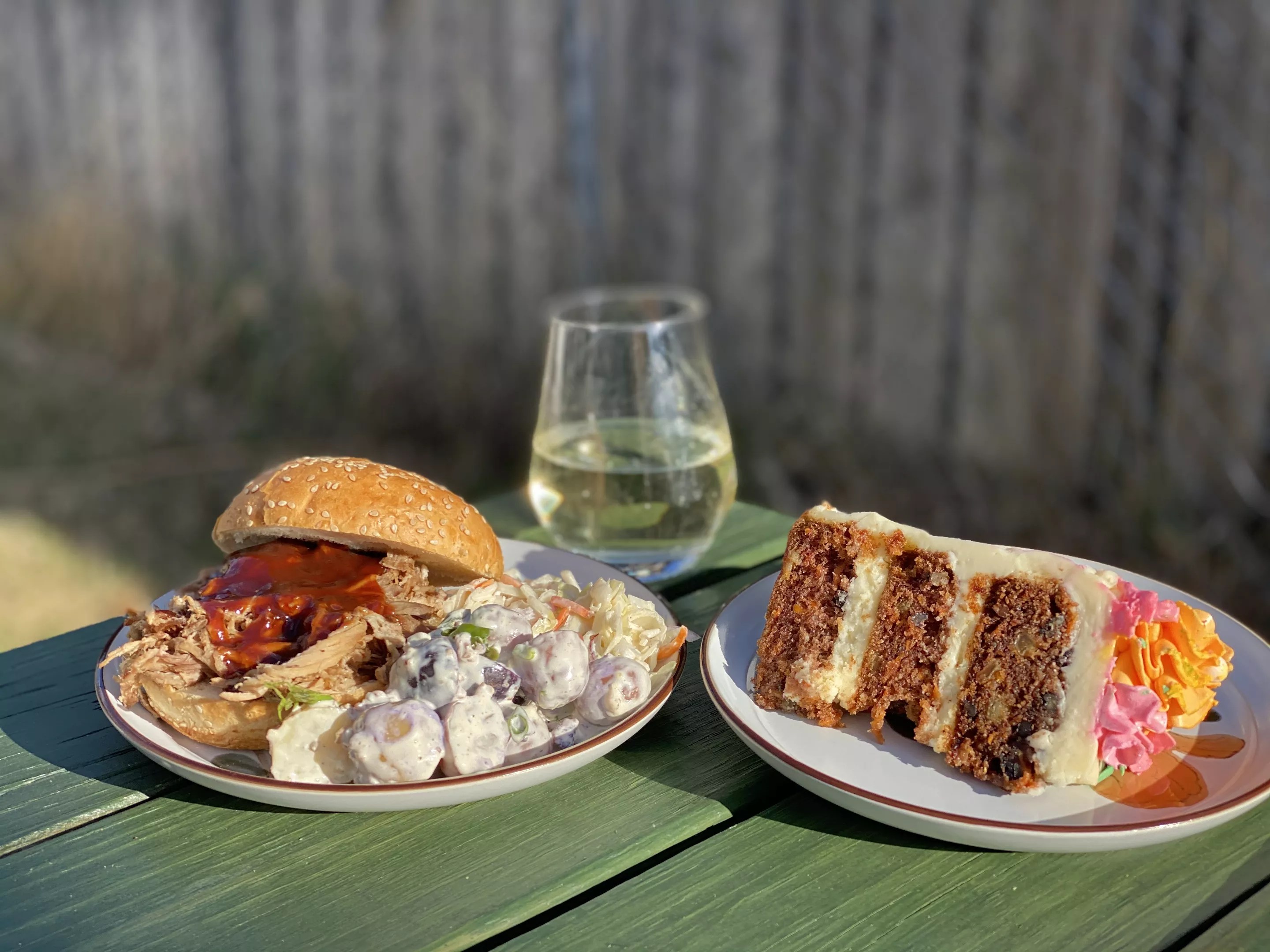 How the pesto-marinated burrata maintained its structural integrity and beauty through transport is beyond me, but more impressive was the rich flavor of the pesto balanced with the bright and fresh and creamy burrata. Meanwhile, the roasted tomato-infused spinach artichoke dip offered nothing but comfort; I can only imagine how mind-blowing it is when the parmesan gets a quick broil before serving. We were given plenty of spelt crackers and thin baguette slices to get us through, and it was everything I could do to pause snacking to move on to the pulled pork sandwiches. While the price tag initially gave me pause, Bigsby’s pork servings are definitely enough for three to four sandwiches, including the separate container of sweet tangy sauce. However, the steakhouse potato salad, with it’s gorgeous halves of purple potatoes, crumbled bacon and light creamy dressing, is something you will have to fight over. That is, I don’t even like potato salad and I’d order this for lunch on its own. The coleslaw was a welcome pork topping, but probably wouldn’t work on its own as a side. Pulled pork sandwiches, potato salad and carrot cake. Leigh Chavez Bush