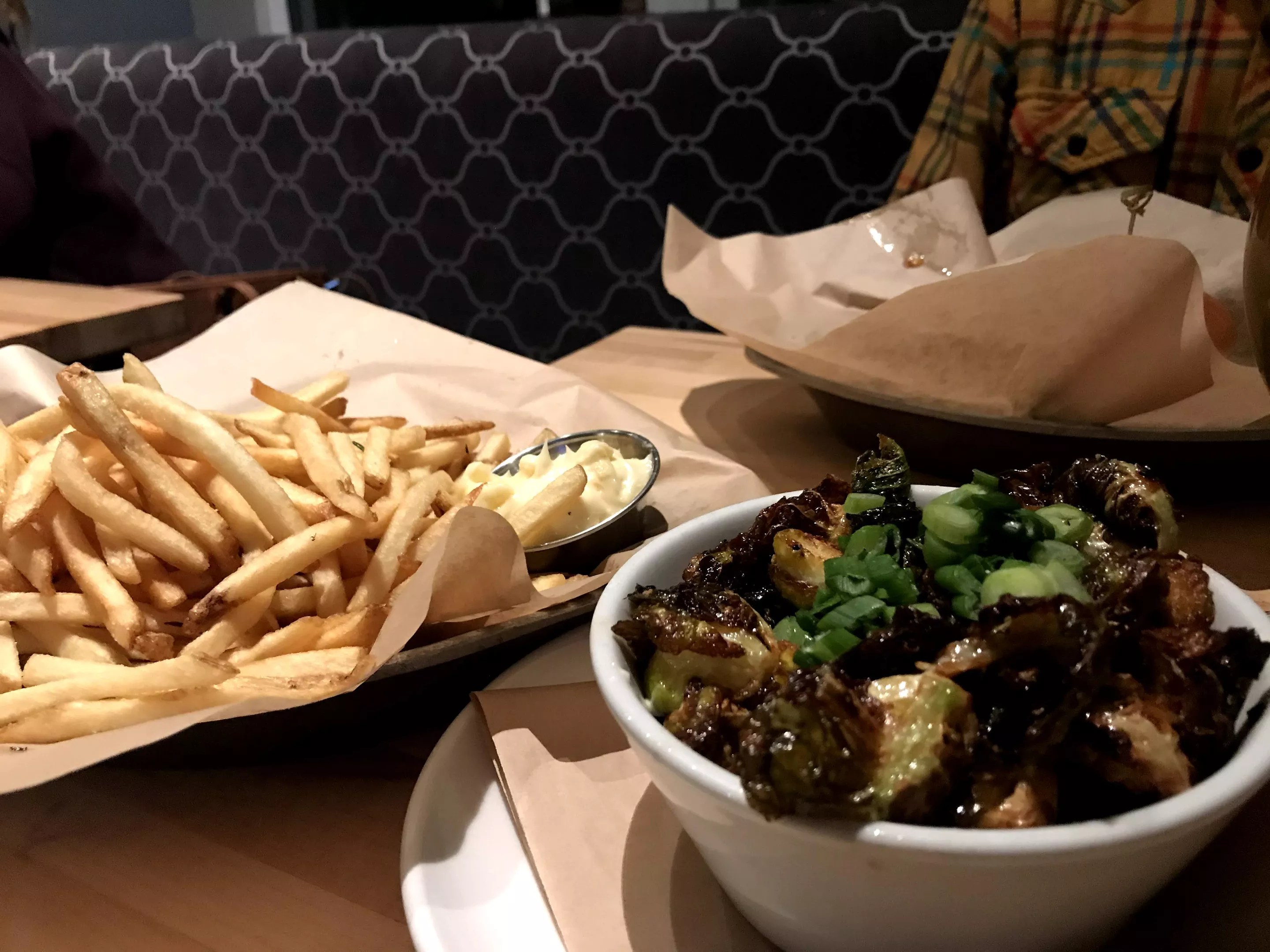 Fries and Brussels sprouts are served in large portions, even during happy hour.