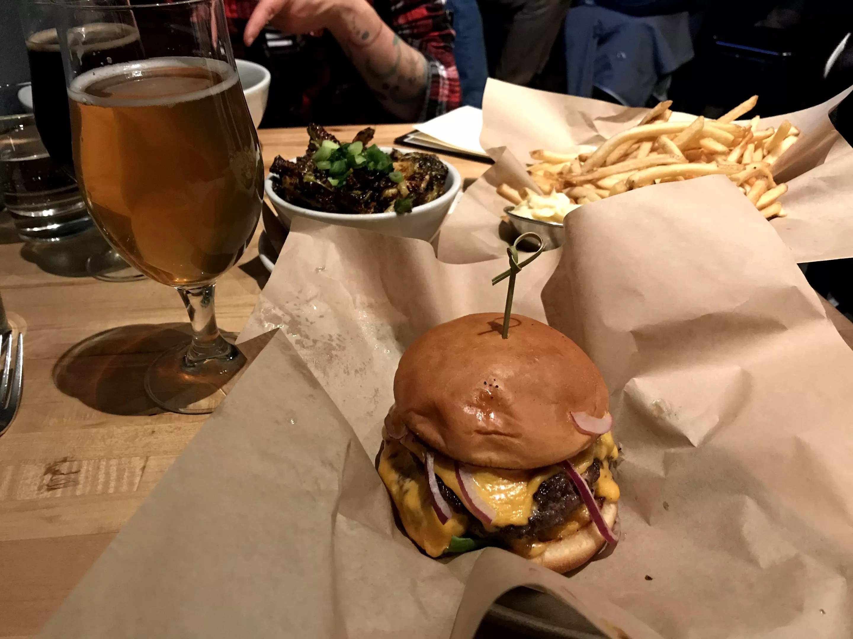 After the sprouts, we turned our attention toward the burger: two greasy patties on a generic bun, with (what looked like) housemade pickles, red onions and deliciously droopy yellow cheese beckoning us forth. After one bite, it was immediately clear that this was the true happy hour score. I sank my teeth in, but soon realized I was full and would be taking the rest home. Briar Common’s ample portions are impressive, but when it comes to price versus flavor, this gastro-brewery might be better suited for dinner; I’m already craving a taste of fried chicken and other colorful full dinner options – as well as that kimchi beer.