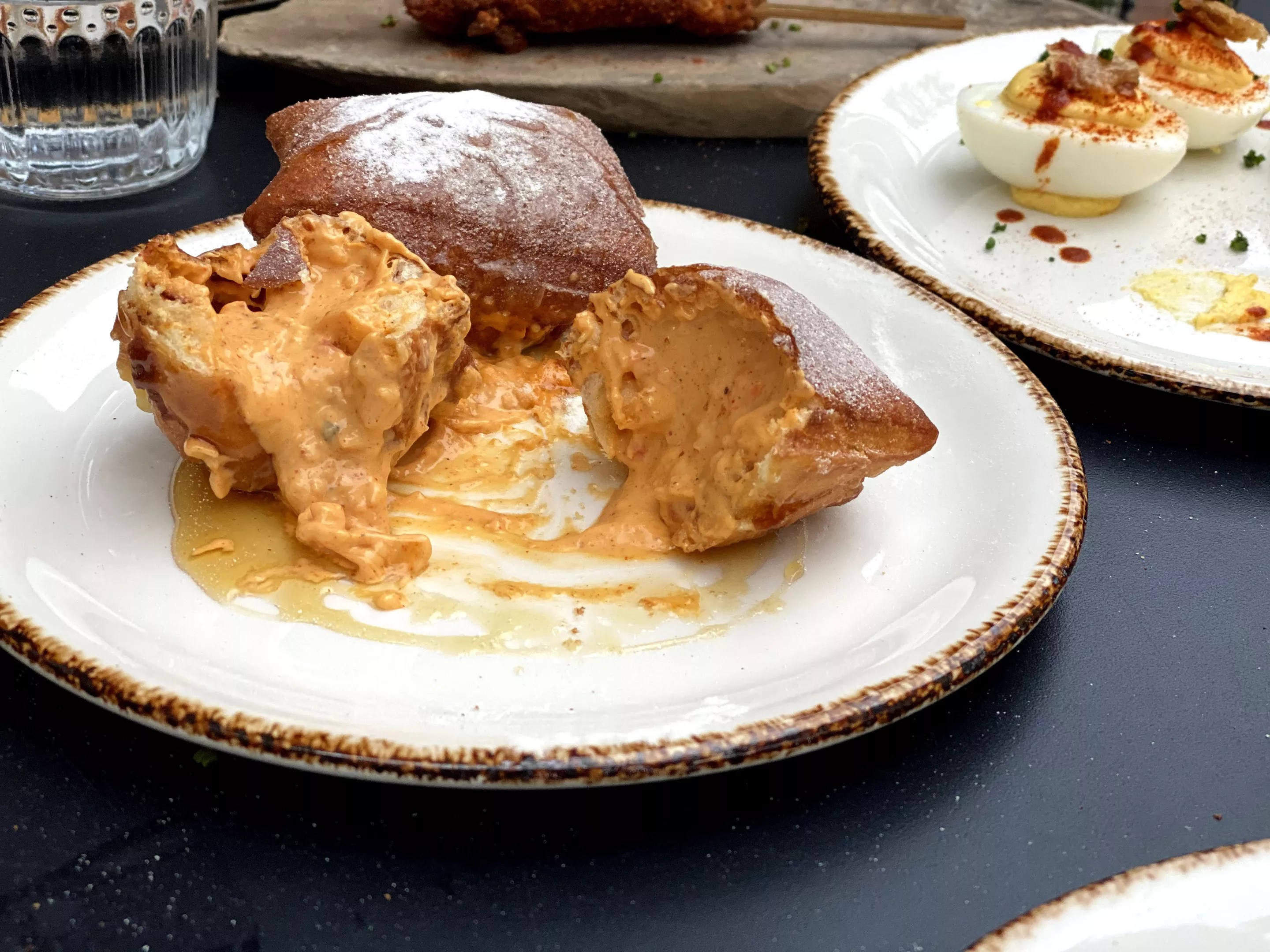 I polished off the head cheese while my friends fawned over Julep’s pimento cheese beignets. Yes, pimento cheese is trendy these days, but who are we to knock a snack made with soft yellow cheese, spicy pepper and mayonnaise? These puffed nuggets had the ideal level of molten cheesy excellence; the powdered cheese topping could hardly be tasted.