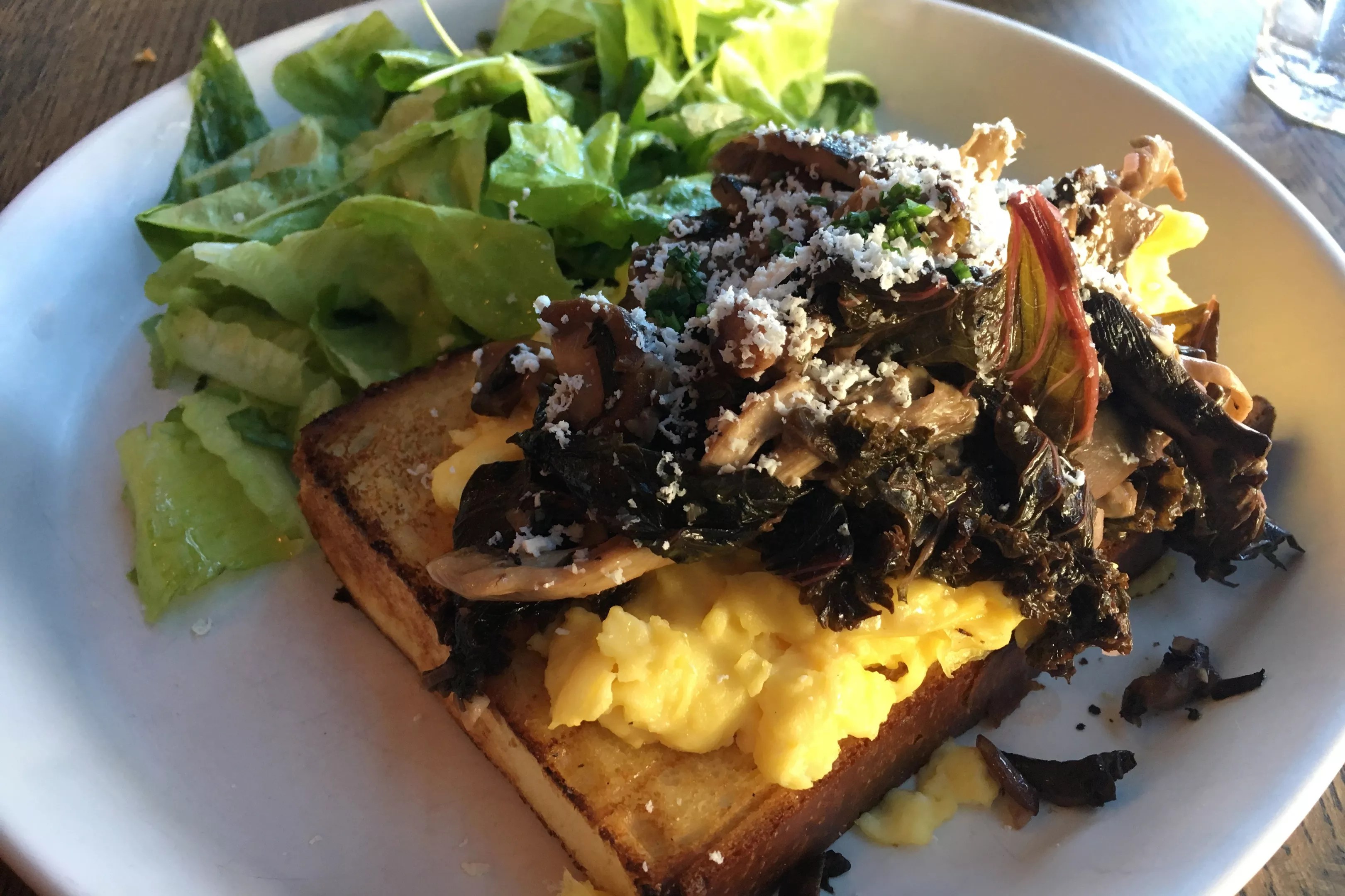 Wild mushrooms, kale and scrambled eggs top a fat wedge of toast.