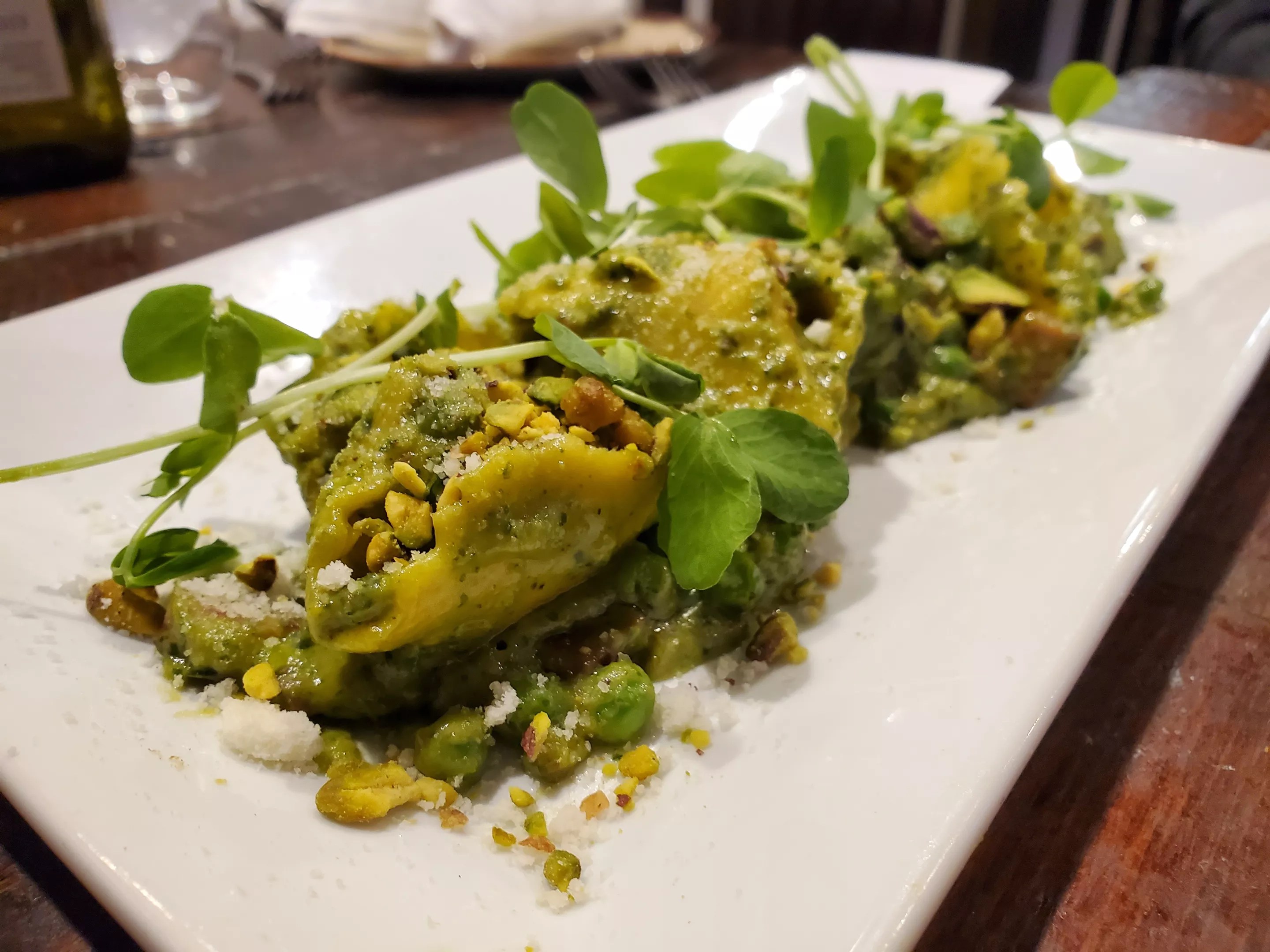 The tortellini ($23) is a standout on the opening menu. To make the filling, the end pieces of the mortadella served in the deli are whipped with goat cheese for a sort of mortadella mousse. The pasta is then coated with a vibrant green, creamy pesto and topped with crunchy pistachio pieces.