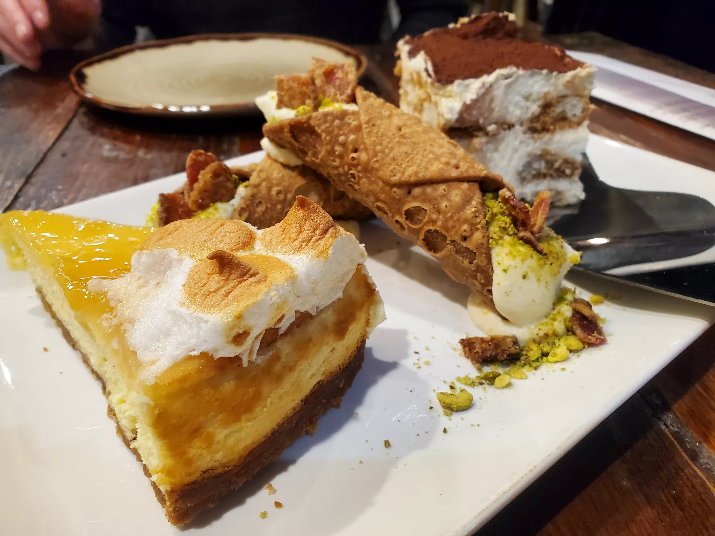 Desserts include lemon meringue cheesecake, a cannoli with candied bacon and classic tiramisu.
