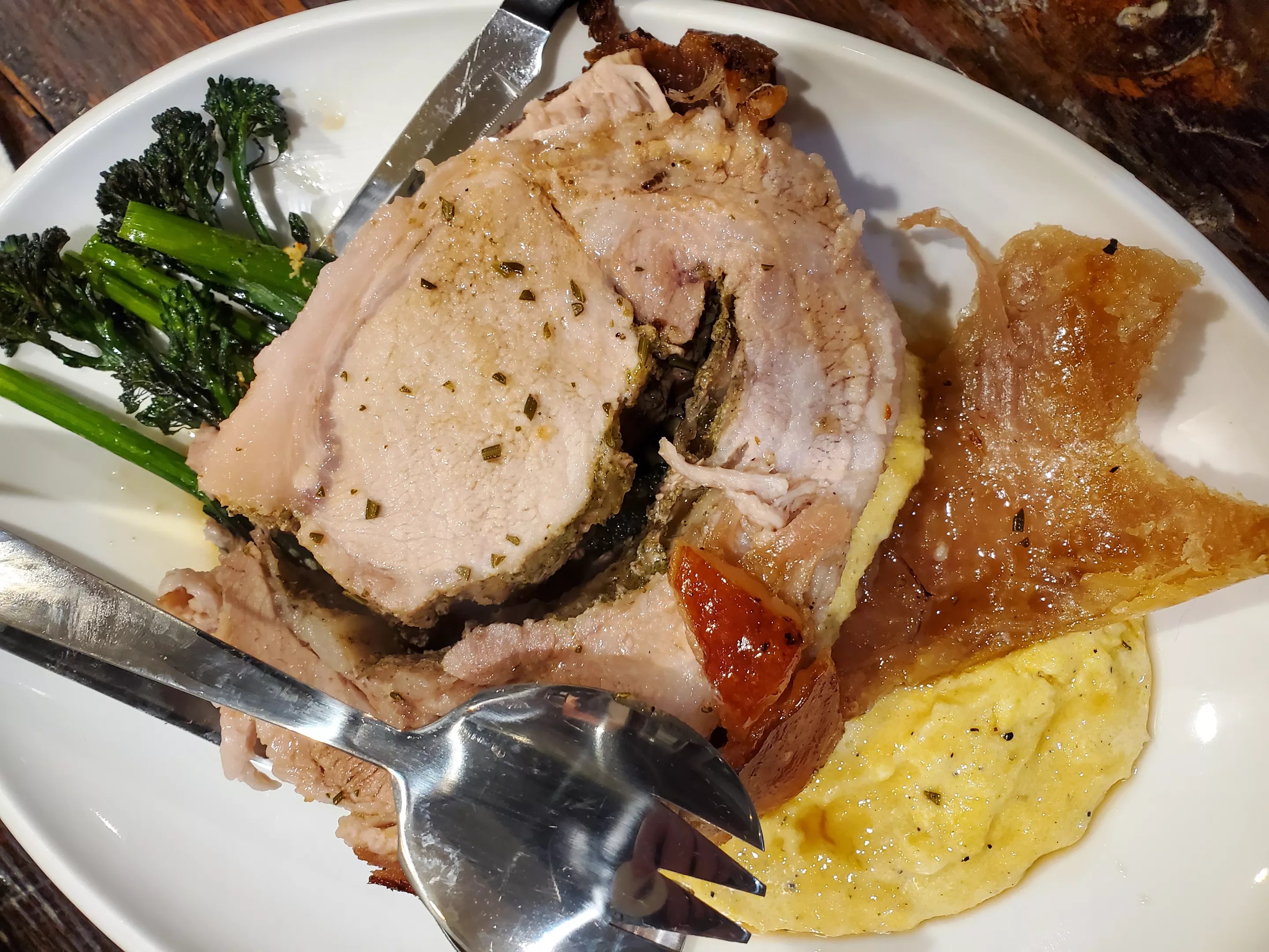Mortadella is also key in the Italian foot-long hoagie ($20), one of four extra-large versions of the deli’s daytime offerings. The menu is rounded out by a few vegetarian-friendly options, like eggplant lasagna ($19), as well as two large-format entrees designed to share: a whole roasted chicken with polenta and garlic kale ($54), and a hulking slice of porchetta ($52) that’s cooked for four hours until the skin is shatteringly crisp. It’s served with polenta and broccolini.