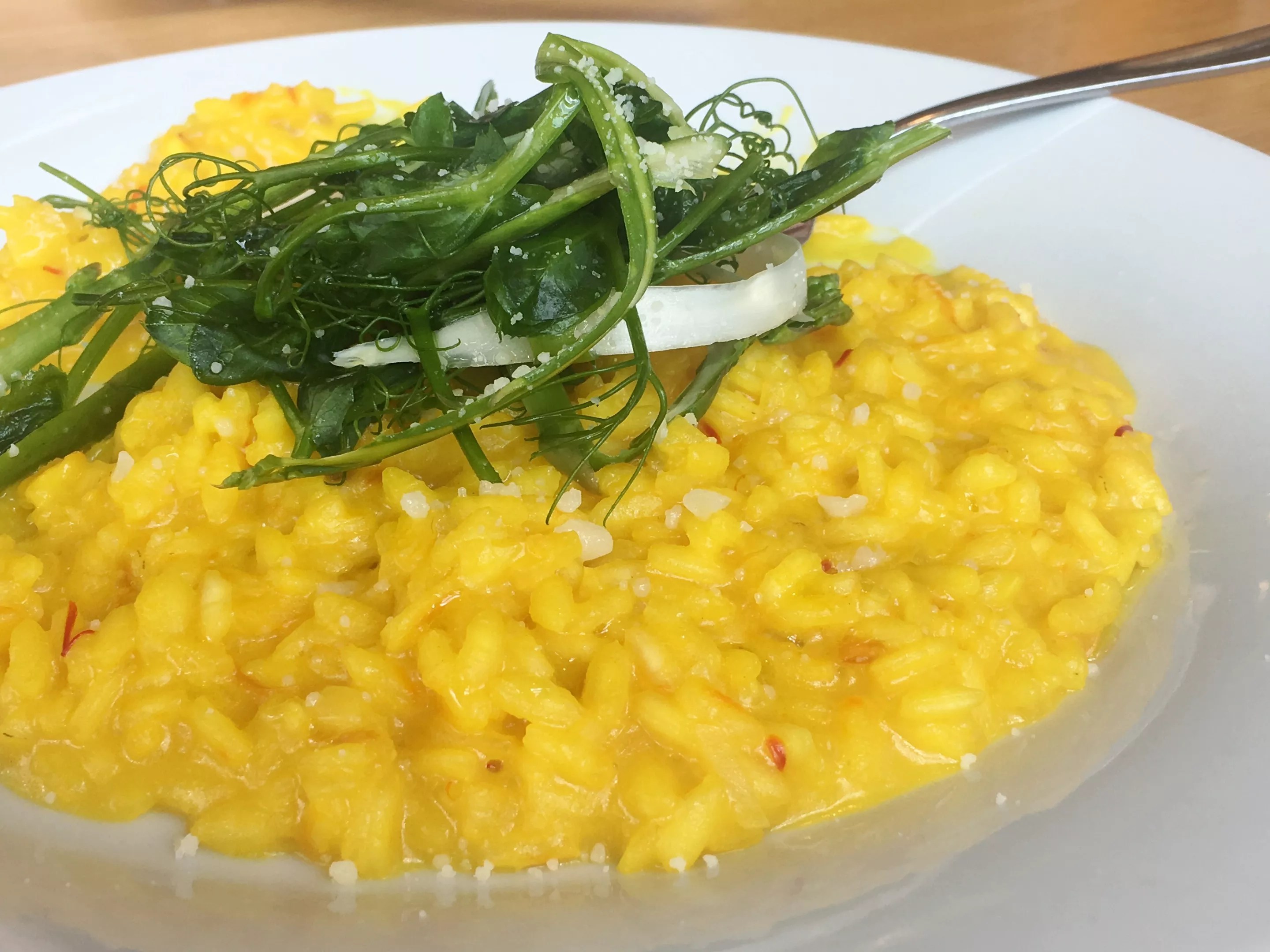 Il Posto’s calamari aren’t the typical breaded-and-fried rings. Here, squid are served “alla marchigiana” (in the style of Italy’s Marche region); they’re stuffed with a mixture of breadcrumbs, herbs and anchovy before being cooked and sliced into bite-sized pieces alongside broccolini and tomato sauce. Other appetizers include asparagus soup with morels, grilled octopus with black hummus, and burrata with housemade lavash crackers. If you’re lunching with a group, a tagliere board with meats and cheeses is a good place to start. Risotto tinted yellow with saffron and topped with pea shoots. Mark Antonation