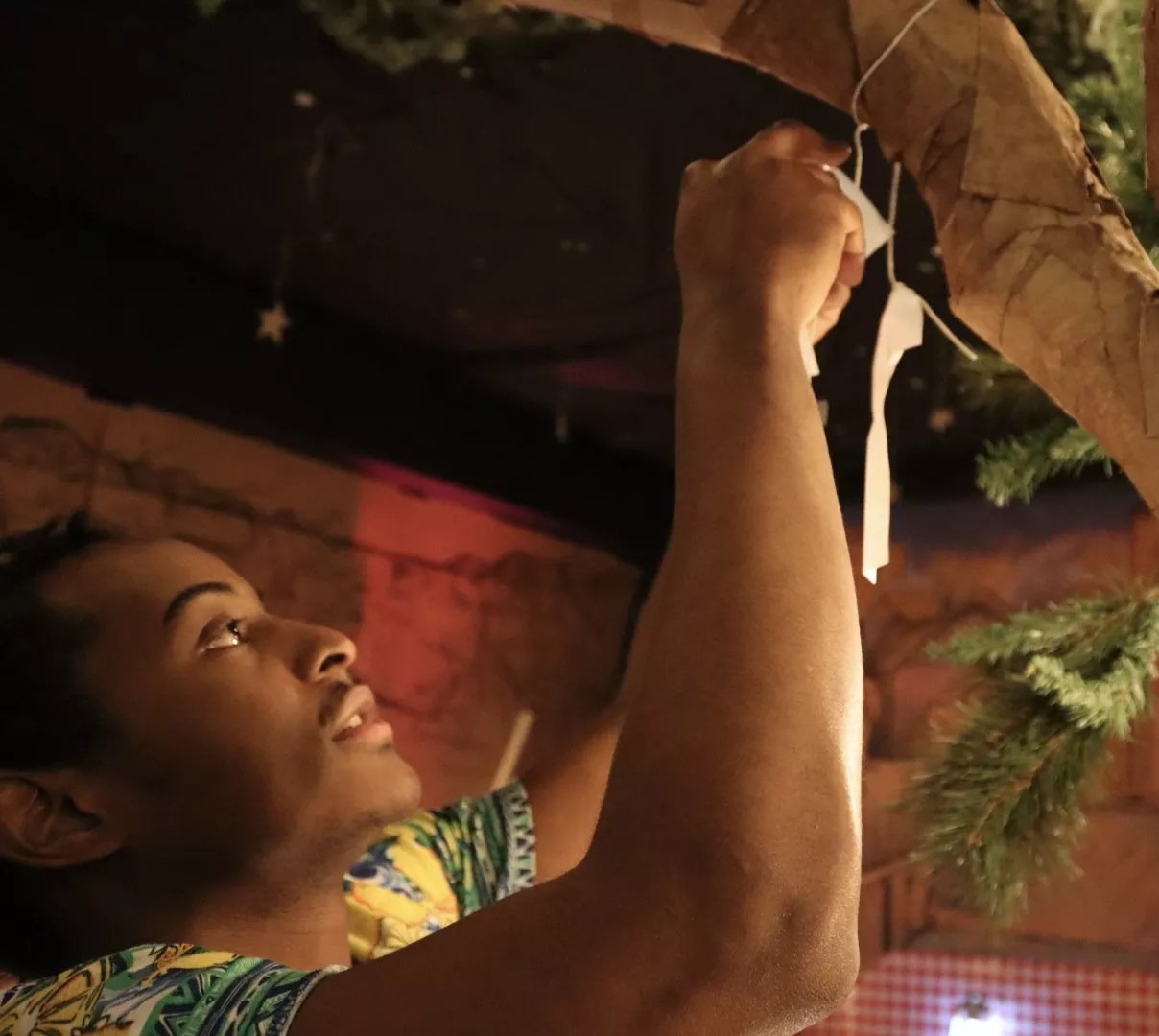 “It’s a backyard cookout that is open to the neighborhood,” Gilkey says. “We really wanted to bring comfort and a sense of belonging within our space. Through Uncle Jerome and CJ, you kind of get pulled into two different worlds, going through the grief of the passing of Grandma Harriet and her impact on the world and the community around them.”