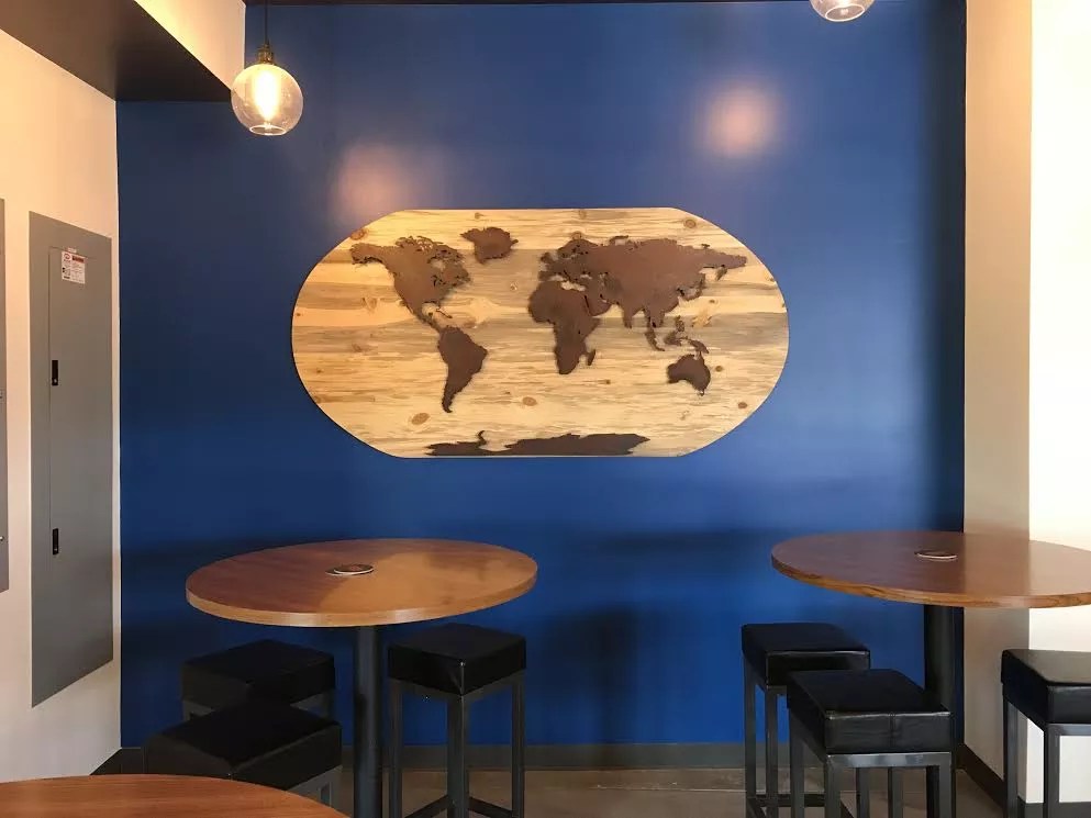 The 2,200-square-foot brewery includes a seven-barrel brewing system and a taproom with an international travel motif. One wall is decorated by an artsy map of the world, while another has vintage suitcases that will serve as shelves. The bar is topped with inlaid maps of Colorado.