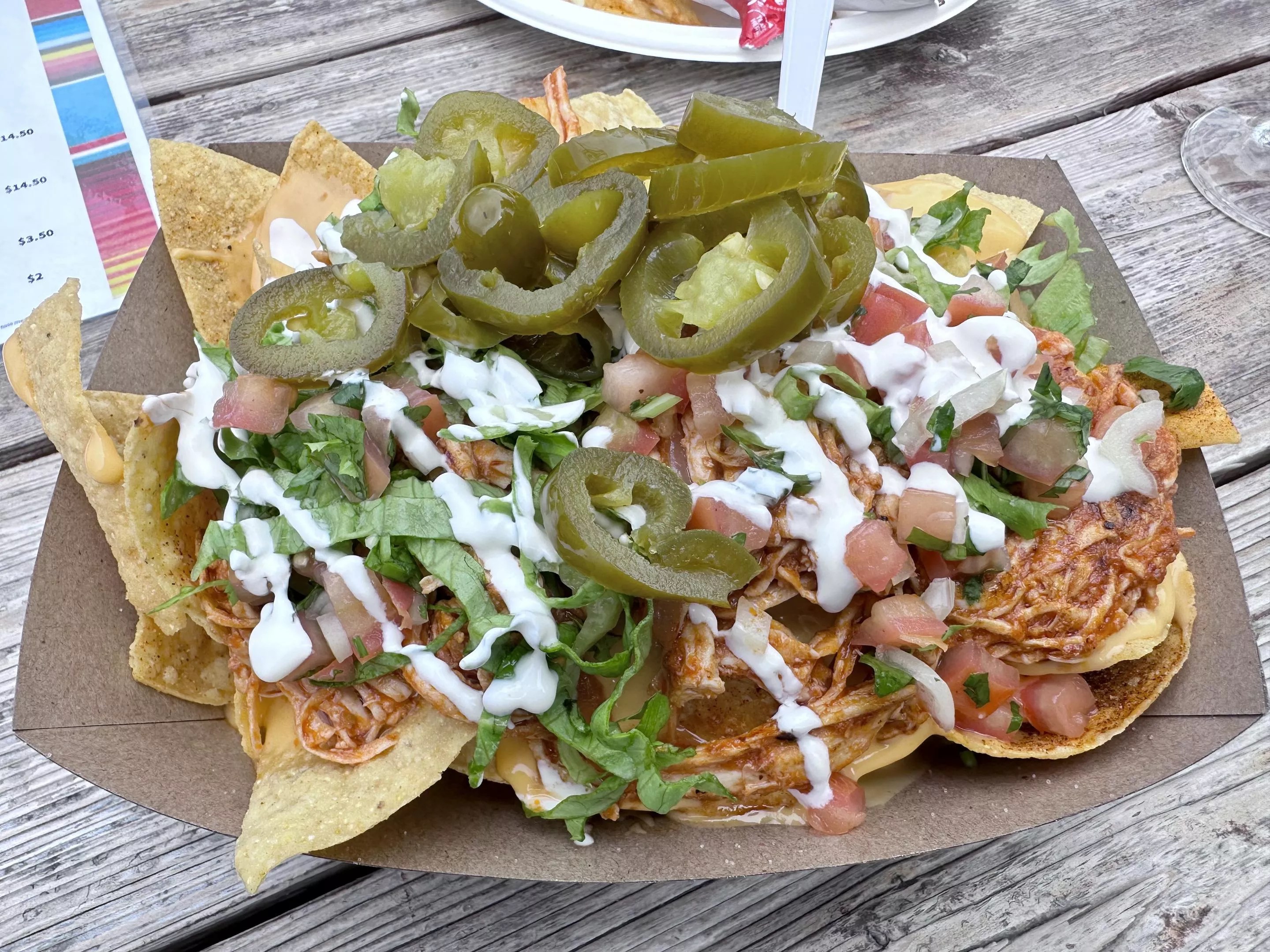 Nachos topped with chicken tinga, lettuce, pico de gallo, sour cream, pickled jalapeños and hot salsa.