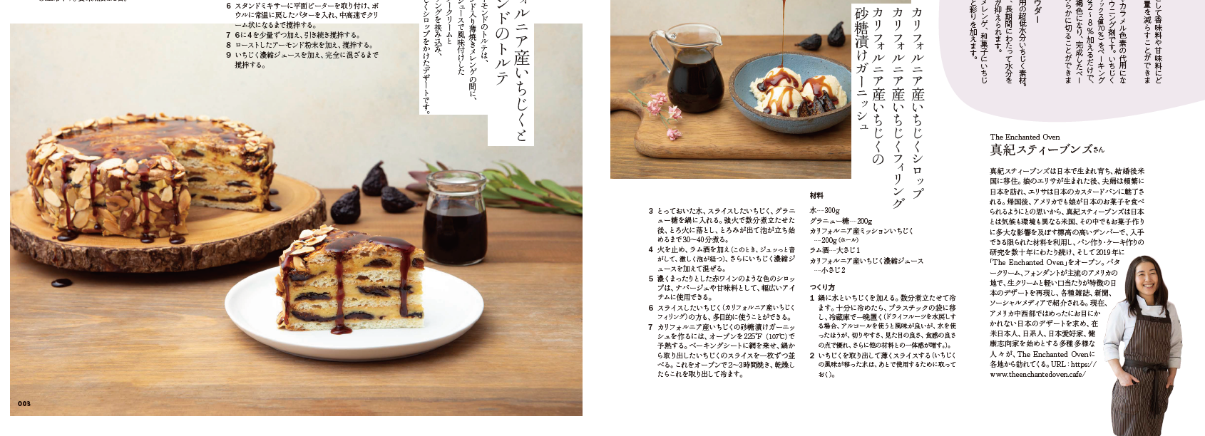 For her part, Stephens came up with five recipes using California figs: almond florentine, no-bake rare cheesecake, macarons, almond torte and a bonus multi-purpose California fig syrup/California fig filling/candied California dried fig garnish. Stephens and her creations, along with the work of the Japanese chefs, were featured in a Japanese bakery industry magazine, and this spring, the recipes were collected in a brochure for a national trade show in Tokyo, with Stephens’s creations getting the lead spot.