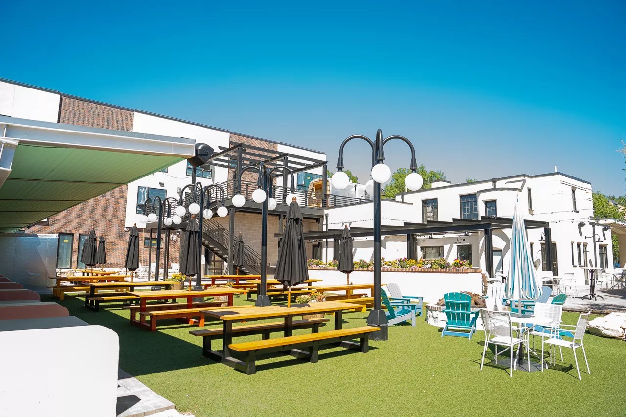 A former neighborhood swimming pool in the back is now a patio with greenery, a fire pit, a few dart boards, a cornhole setup and a row of cabanas — three of which have their own mini-fire table.