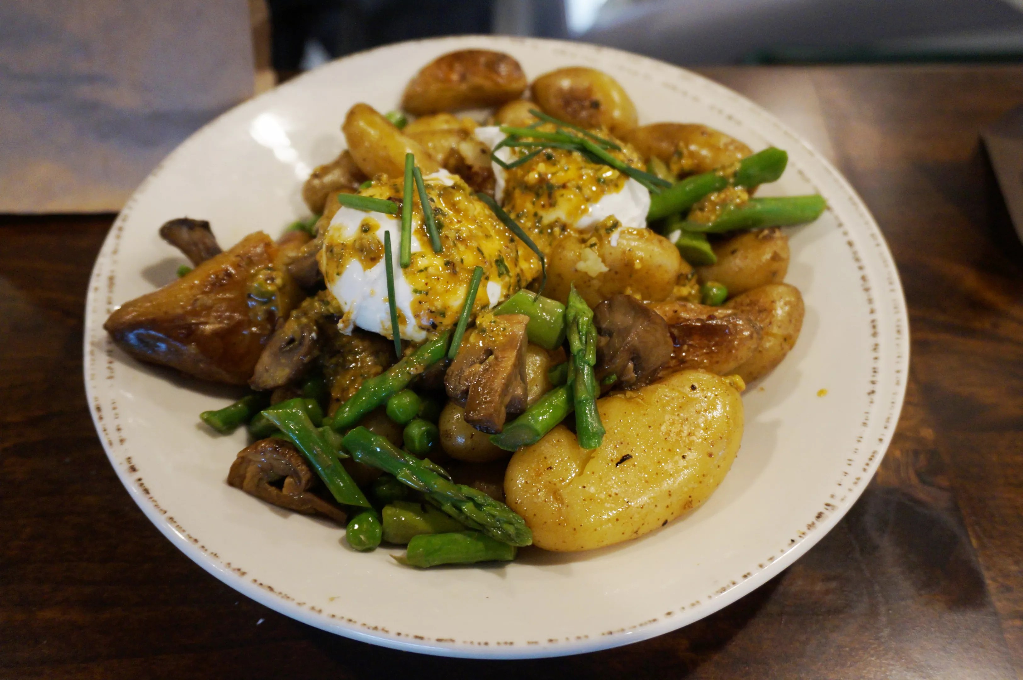 The healthy bowl, with poached eggs, roasted potatoes and seasonal veggies.