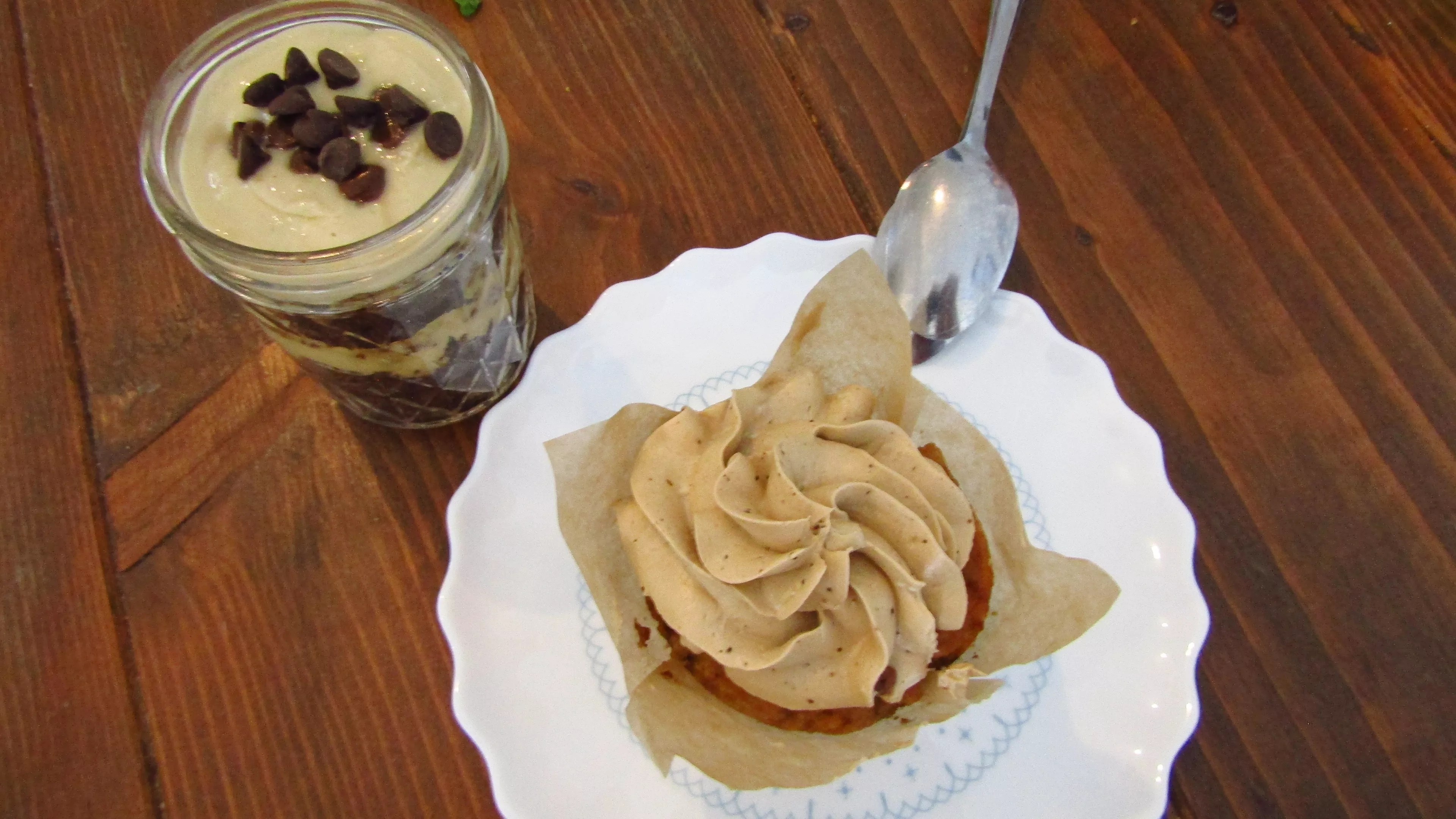 For dessert: a brownie trifle in a jar and a cinnamon-roll cupcake.