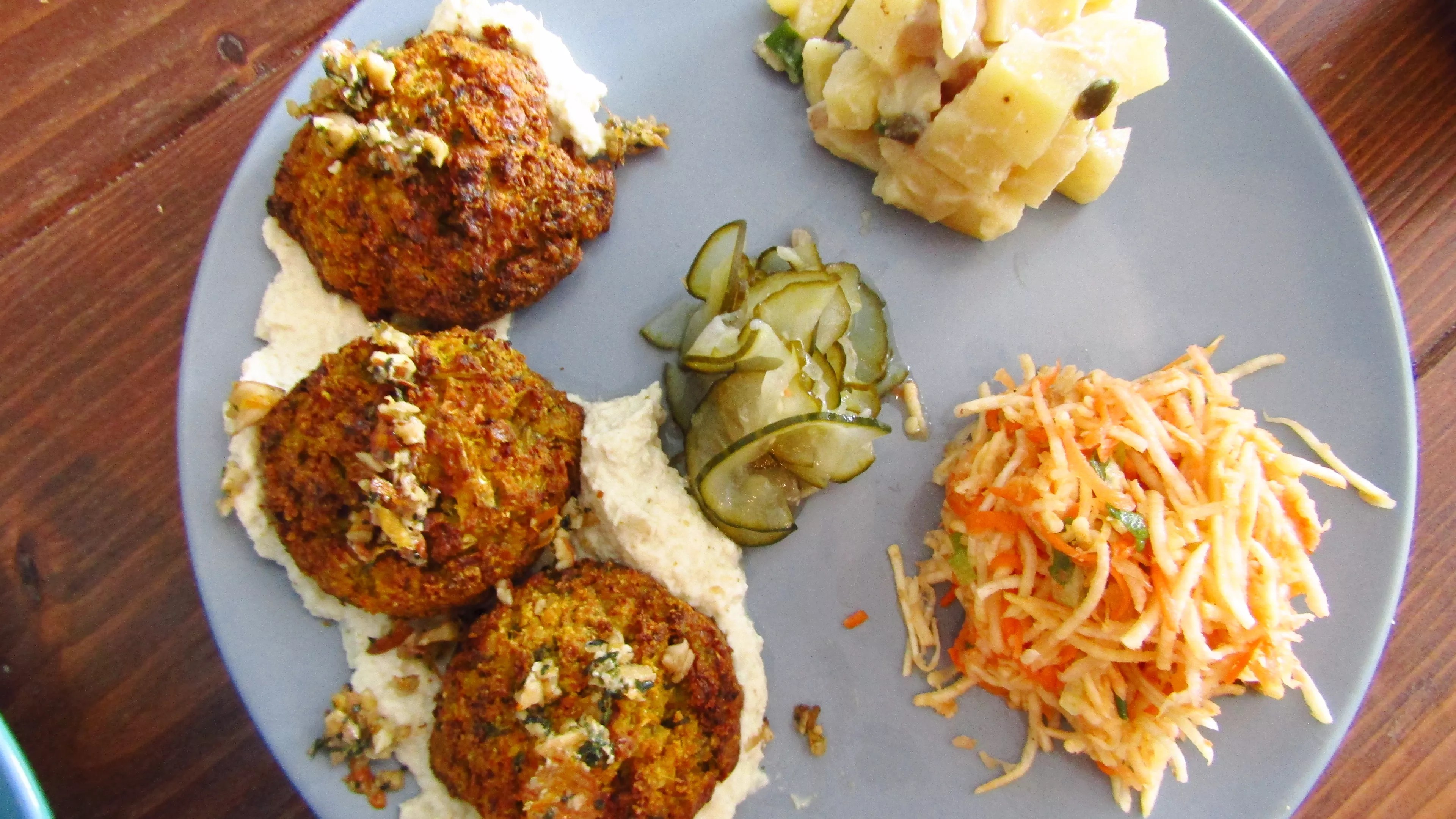Falafel with housemade pickles, slaw and sweet-potato salad.