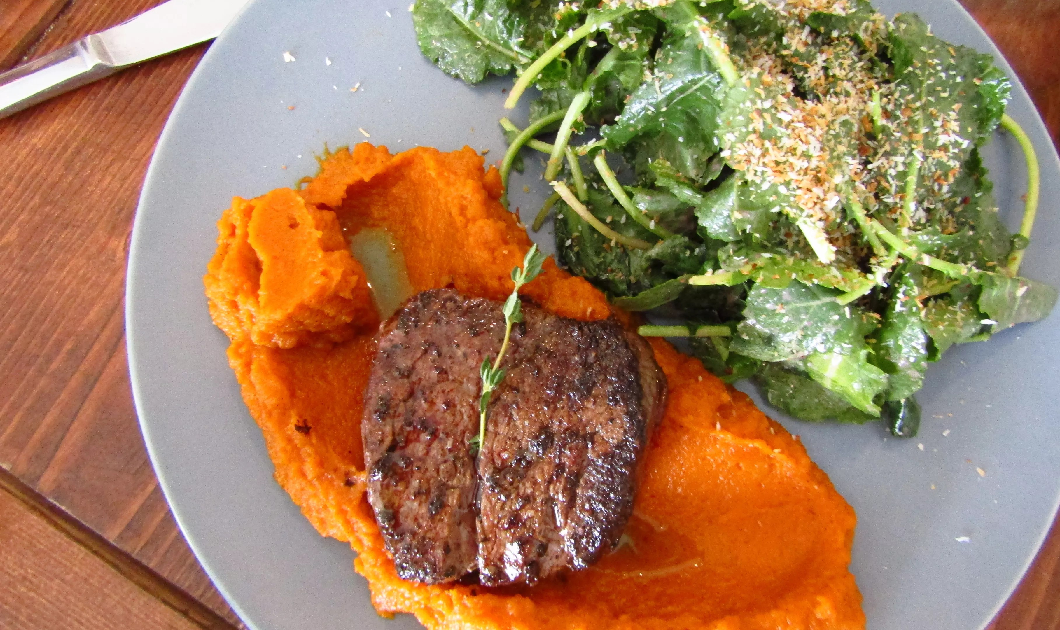 Coffee-rubbed beef tenderloin with sweet potatoes and a baby kale salad.