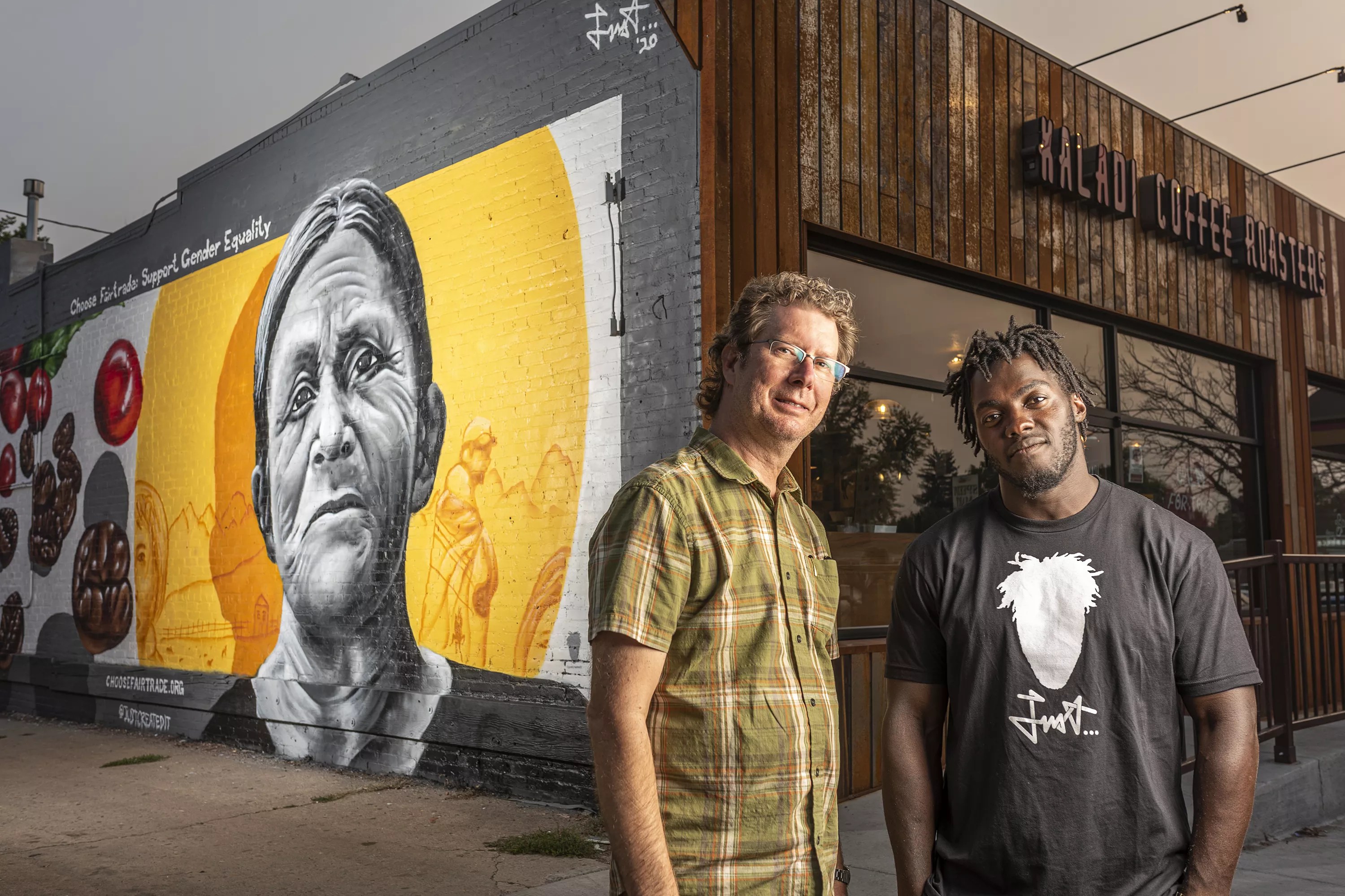 Kaladi Coffee Roasters owner Mark Overly and mural artist Giovannie AKA Just in front of the completed “Choose Fairtrade: Choose the World You Want” mural.