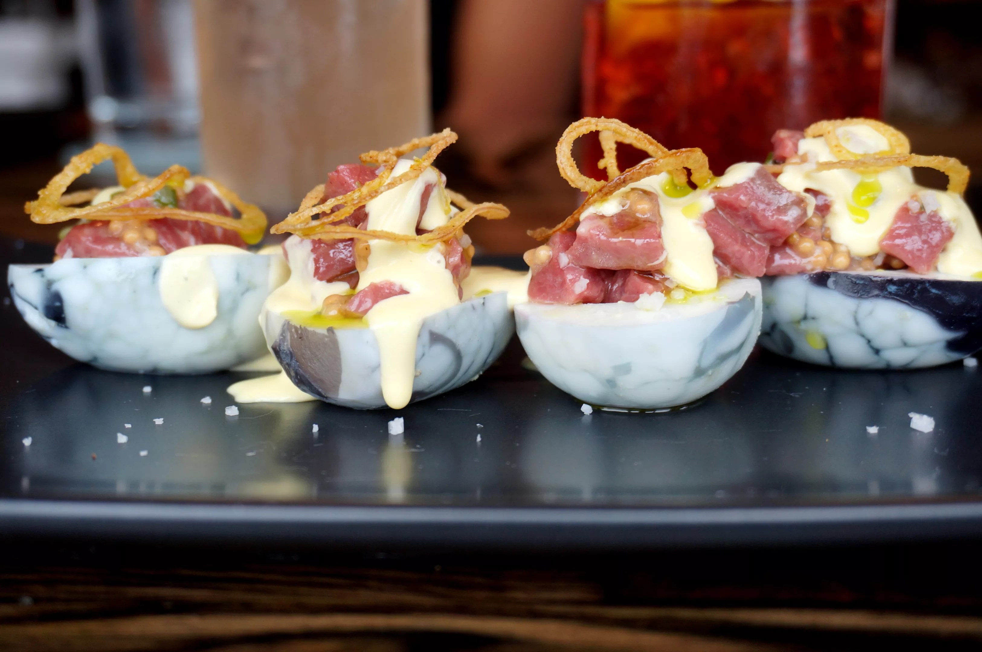 Bar Helix‘s “devilish” eggs come stuffed with Western Daughters dry-aged sirloin tartare and are marbled with a red-wine brine.