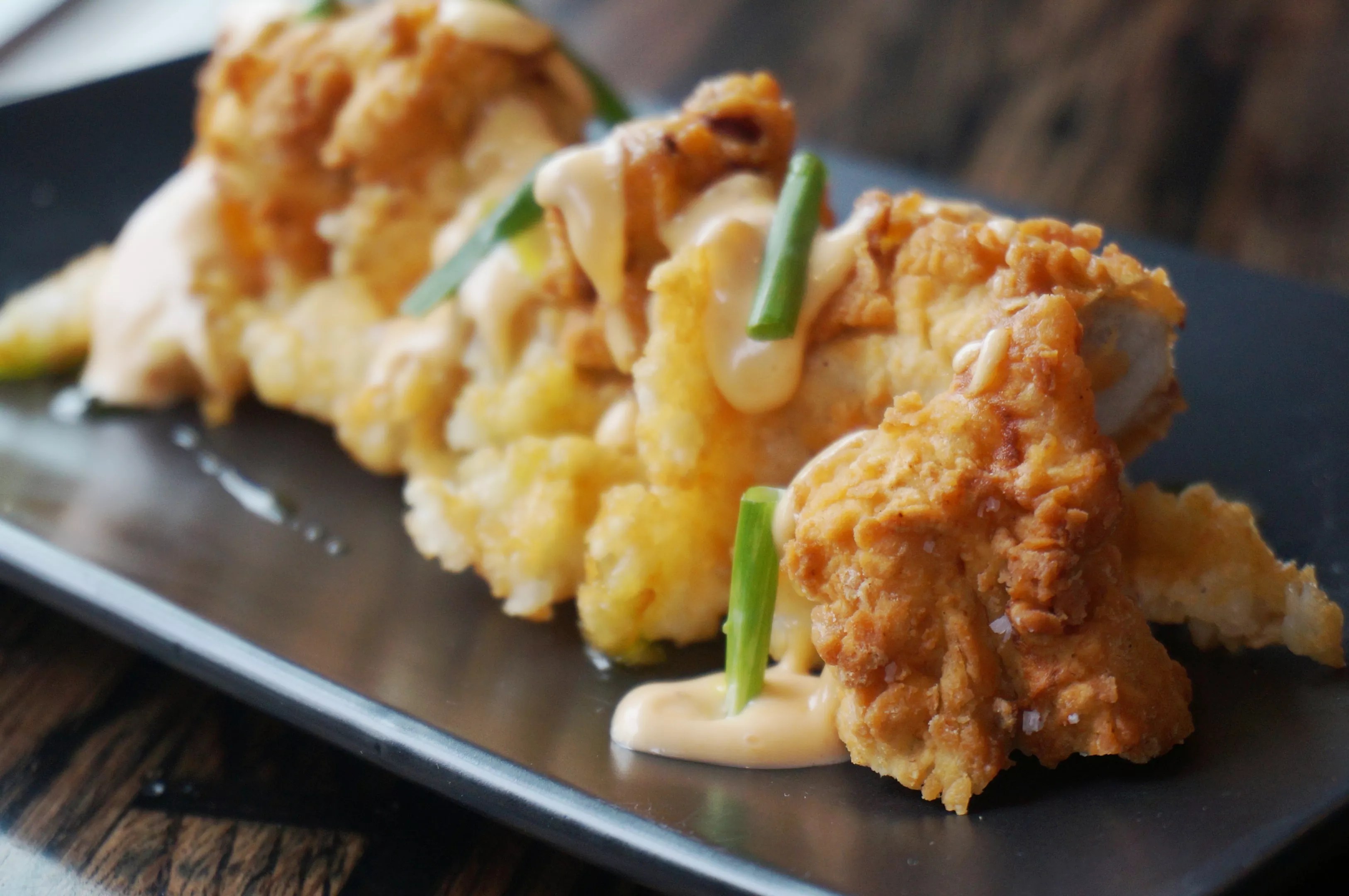 Fried chicken brined in pickle juice and dipped in butter milk is served atop tater-tot waffles