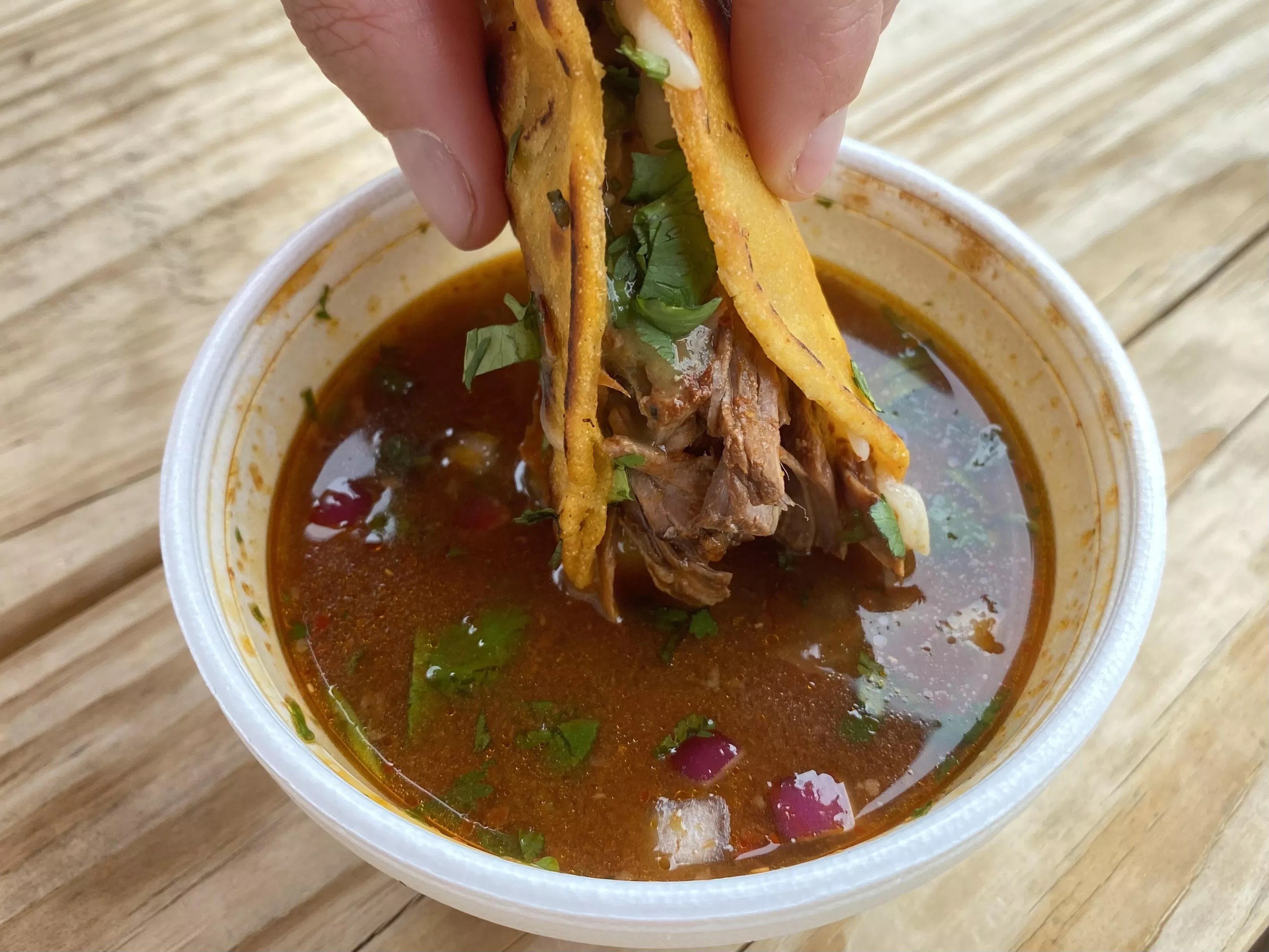 One bite of a KikeÌ taco and you can taste the love and dedication that González’s parents put into making birria daily. The best part about indulging in birria tacos is dipping them in the red-hued consomé served on the side. “It’s a broth formed during the cooking process,” González explains. “It forms with the fat melting and the spices mixing in with everything, and then we separate the oil and consomé so that there is no oil in the consomé, just the broth itself. The oil, we use to kind of fry up the tortillas.”
