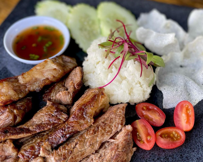 Isaan steak is made with soy sauce, roasted rice powder and chili.