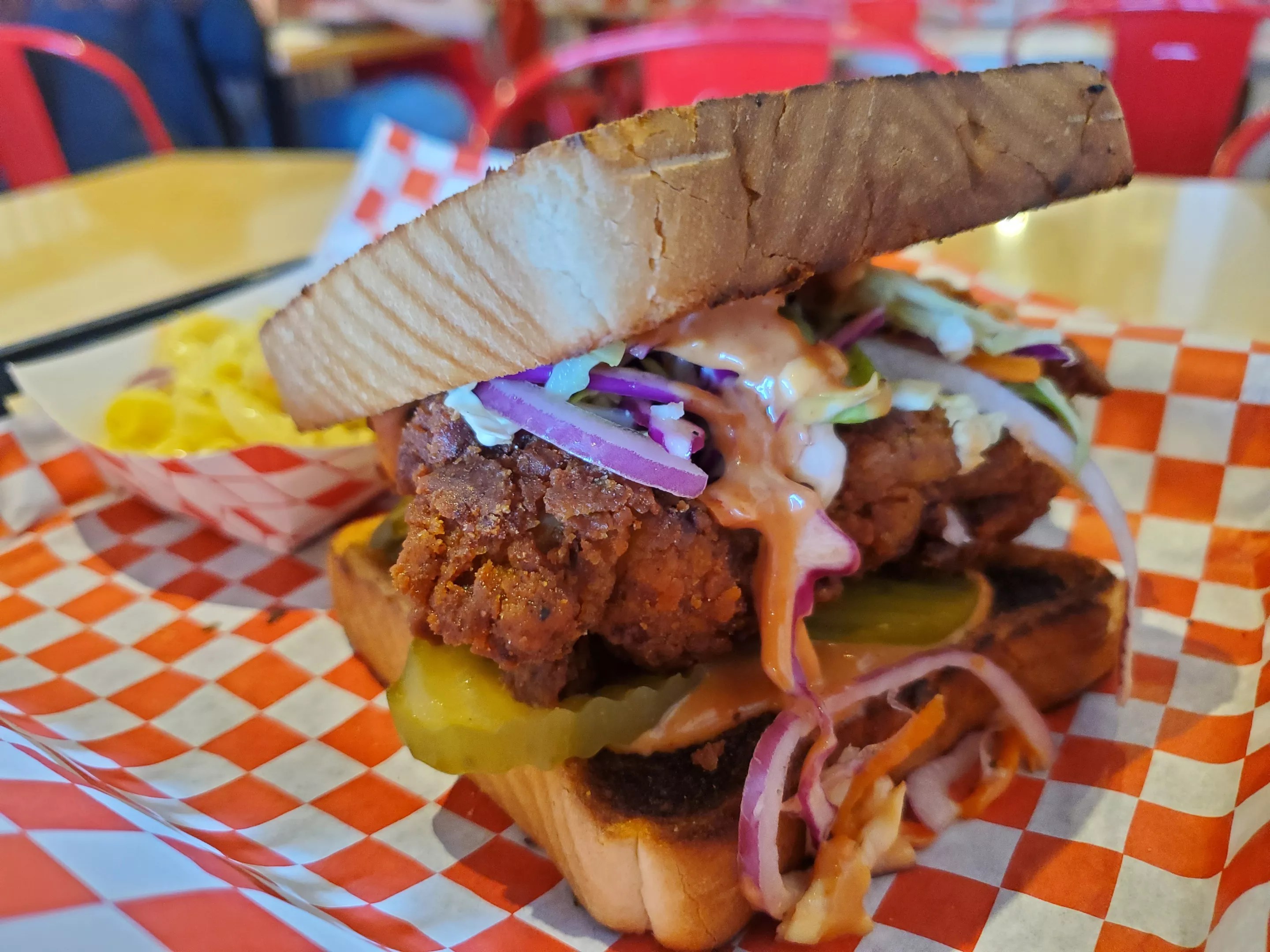 I opted for the spicy chicken sandwich with a side of mac salad, a traditional take on that picnic dish except for the pale yellow hue hinting at the addition of mustard — presumably to add some “kick.” The sandwich was built on buttered Texas toast, which held up well but also led to some overly bready bites. The chicken — a large thigh — was juicy, with a thick, craggy crust for supreme crunch. It came topped with slaw, thick sliced pickles and the sweet-and-spicy Kickin Sauce. Overall, though, this spicy chicken was pretty mild on heat — a good thing for those with a more sensitive palate looking for a slight kick.