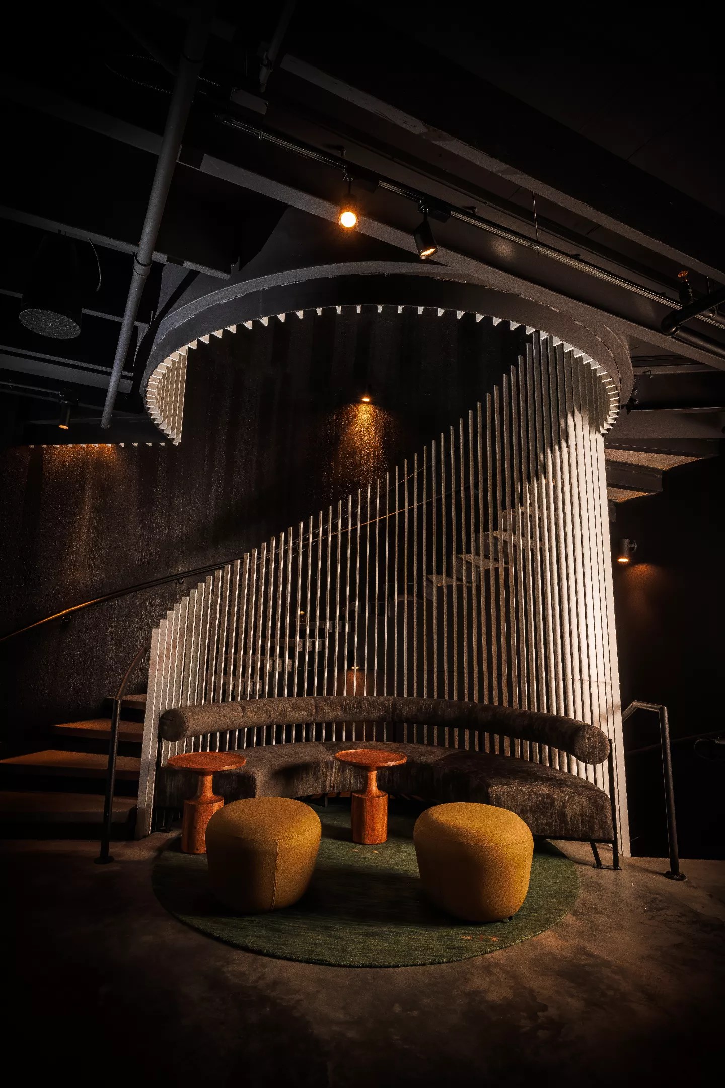 A spiral staircase fashioned like the inside of a whiskey barrel leads up to the bar on the sanctuary’s second floor.