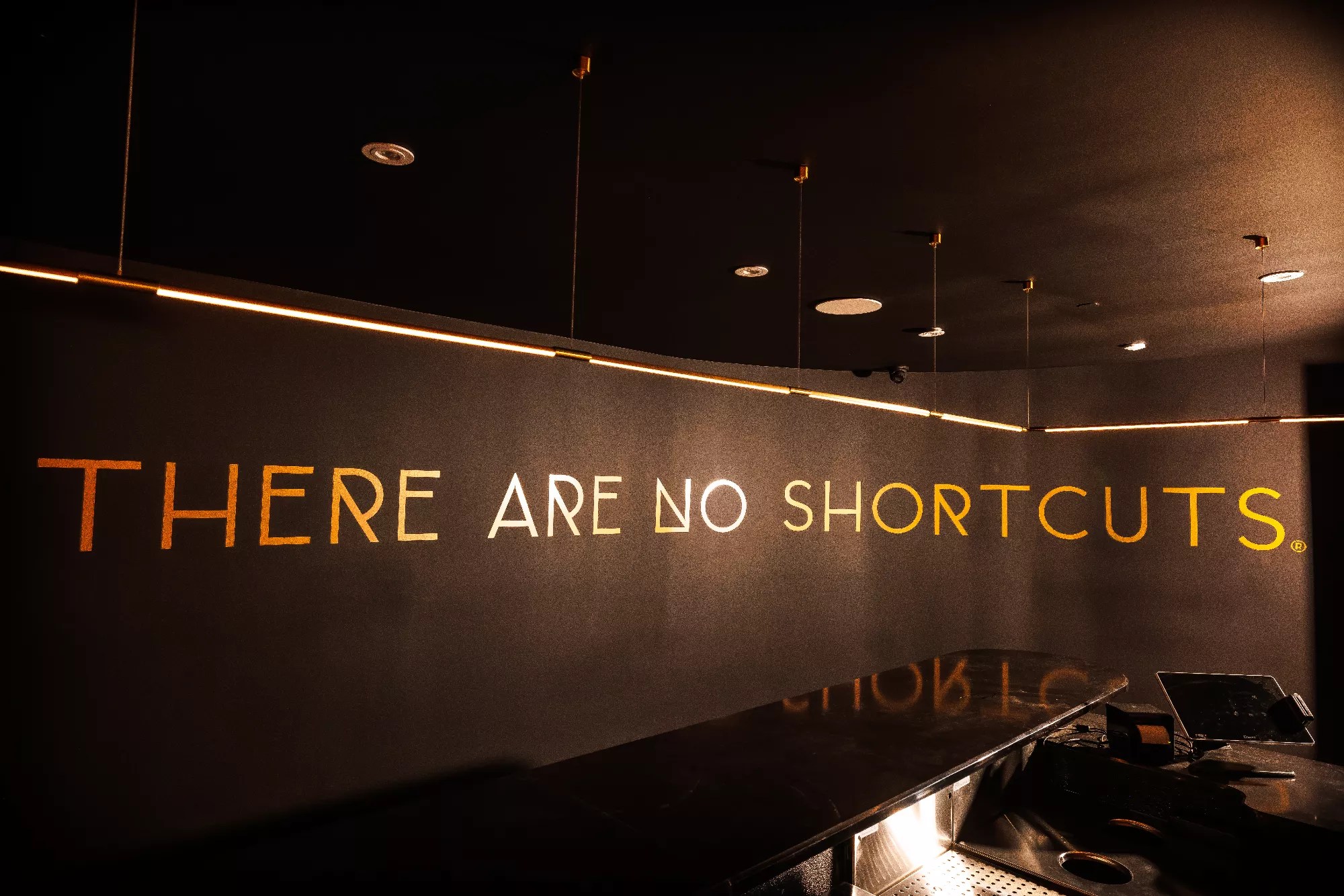 The bar is adorned with one of Laws’s slogans, reflecting its approach to making whiskey: There are no shortcuts.