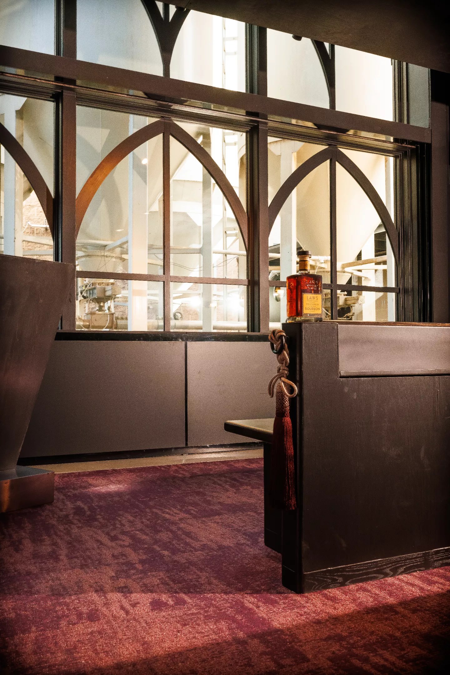 The Whiskey Sanctuary features handmade wooden pews and large Gothic-style windows to lend the space a church-like atmosphere.