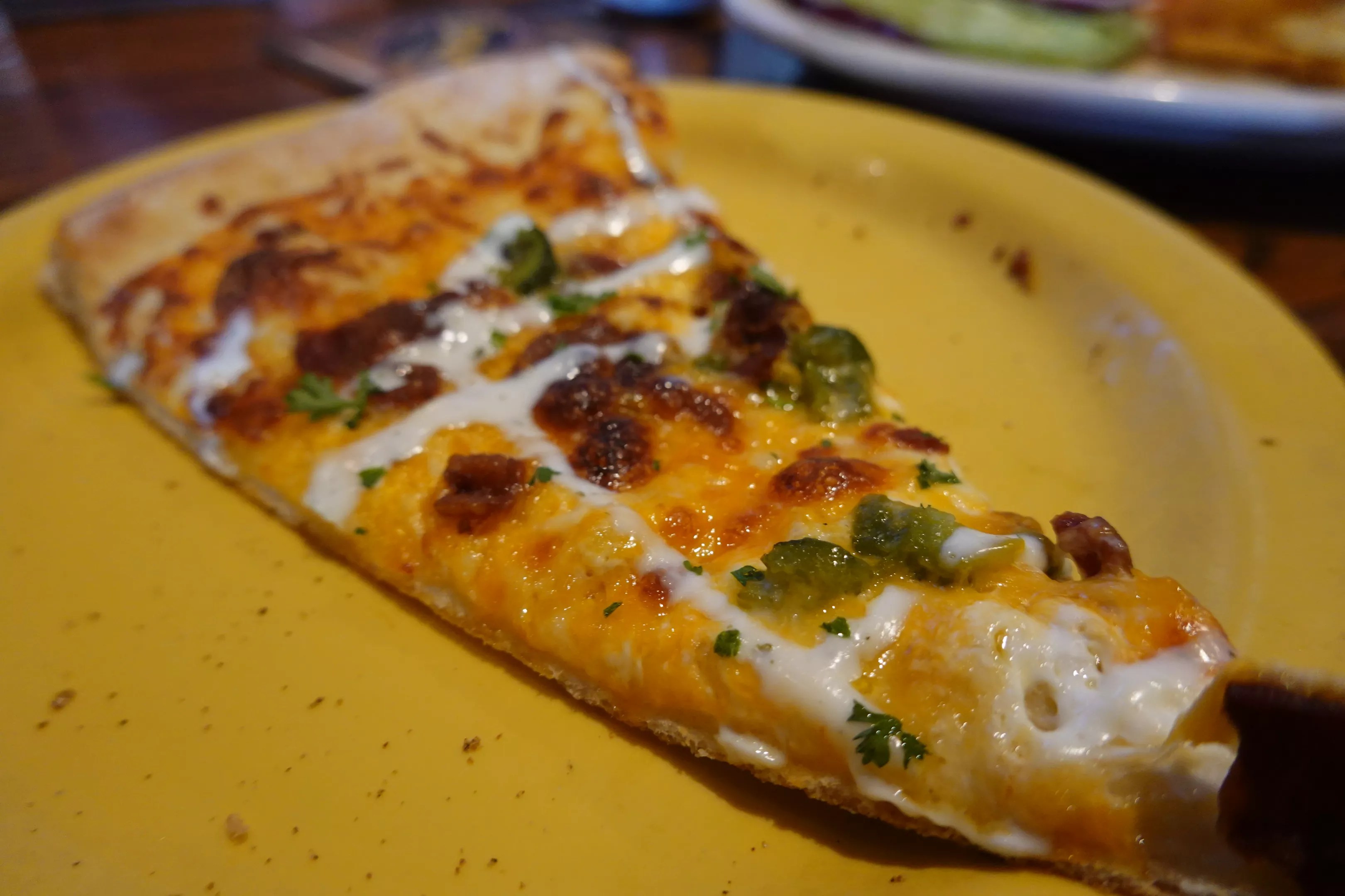 Having a base of cream cheese topped with more cheese leaves the whole pie woefully dry, save for the thinnest ranch sprayed across the top that bears no relation to the one served with the appetizer course. The jalapeños are not roasted, which actually works and gives the pizza some necessary kick and texture, along with the sparse bacon bits. Based on the cook on the crust, I would guess it’s a frozen Sysco special. For me, it falls somewhere between “pizza for drunks” and “pizza you’d be surprised to find at a gas station, but in a good way.”