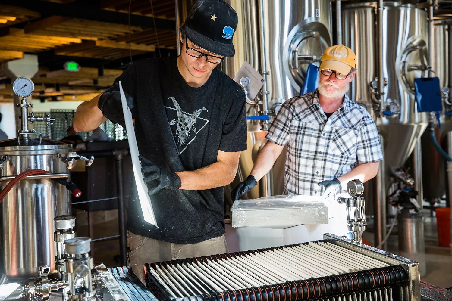 Head brewer Bob Malone (right) and Ryan Mack change out the filtration system for the brewery.