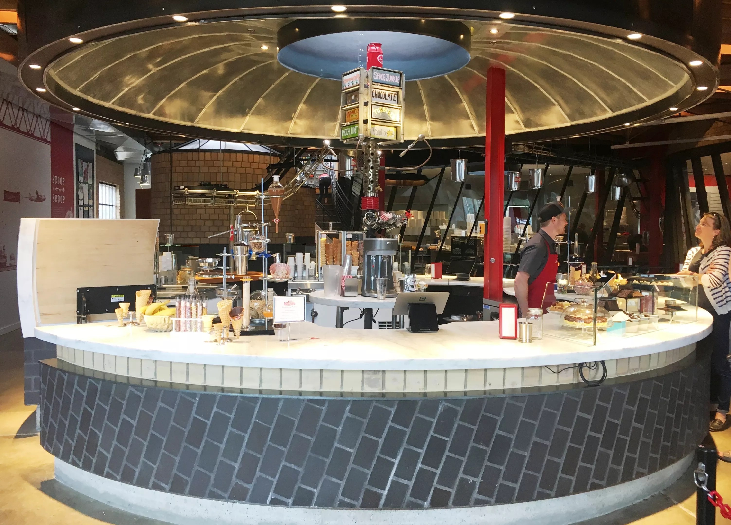 So experiences are built into the interior design, including elements intended to evoke the feeling of being inside a giant ice cream churn, while real ice cream – up to 7,000 gallons a week – churns in high-tech equipment on view through windows overlooking the production kitchen. The factory also houses a bakery where ice cream ingredients are made and special plated desserts and novelties for visitors are prepared. Look through towering plate-glass windows to see pastry chefs baking carrot cake, making brittles and plating fancy ice cream-based desserts. There’s even a vintage copper candy kettle from the original Jolly Rancher factory in Wheat Ridge.