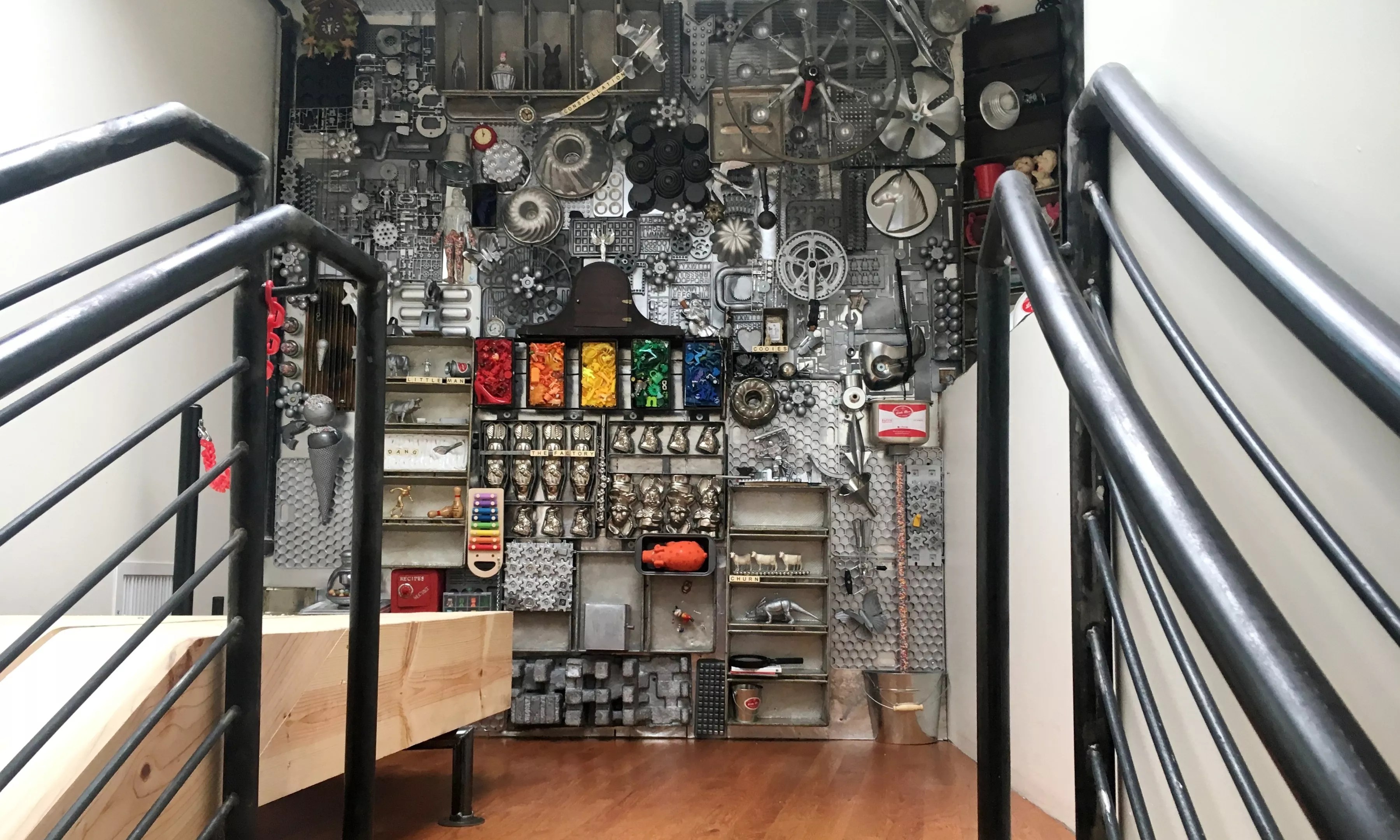 Walls and counters are all curved or undulating, light fixtures made from inverted hardware bins resemble enormous mixers, and there’s even a curved stairway leading to the top of a wooden slide hand-built by Tamburello himself. Two tiled silos standing in the back of the space resemble boiler rooms or enormous storage bins, but they’re really just the bathrooms, complete with heavy wooden doors made to emulate vintage freezer doors.