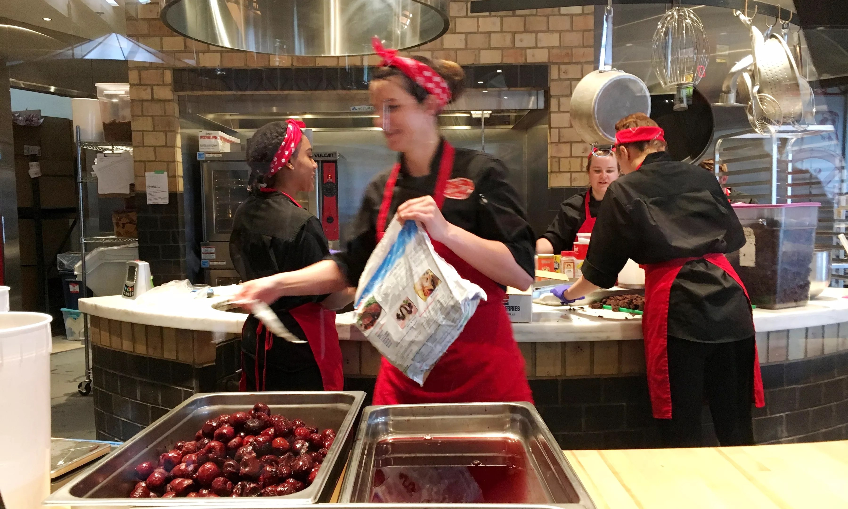 Pastry chefs prep baked goods and other ingredients on the menu.