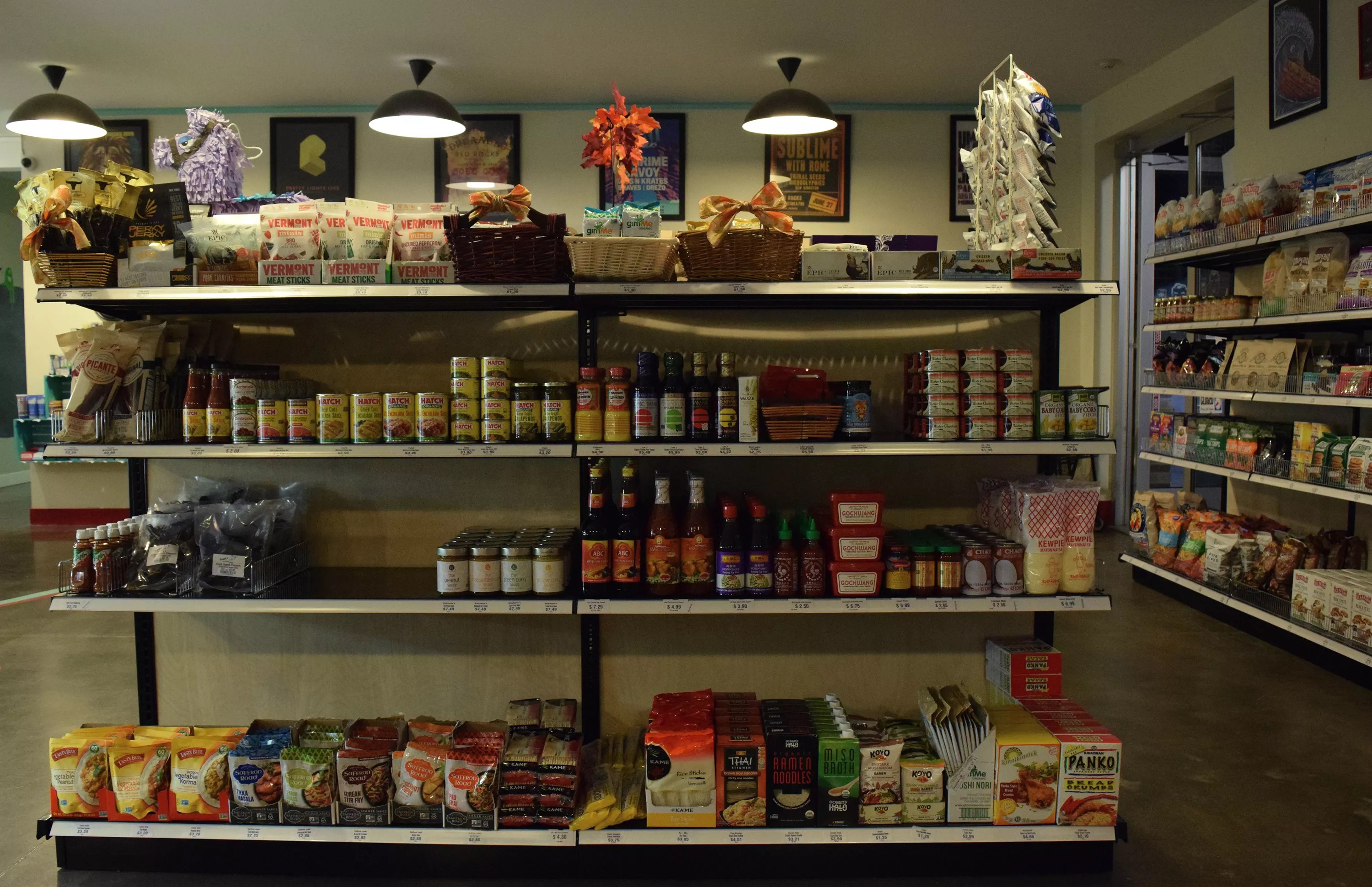 The bodega is stocked with fresh vegetables and fruit in addition to pantry items and specialty beverages like VYBES, coconut water and kombucha. Those with a sweet tooth can find numerous containers of Sweet Action Ice Cream, several varieties of Tate’s Bake Shop cookies, and house-baked goods. There are entire shelves dedicated to condiments such as Suckerpunch pickles and Blonde Beard’s Buffalo sauce. Chicken noodle and butternut squash soups fill another section, and the deli case is loaded with meats and cheeses.
