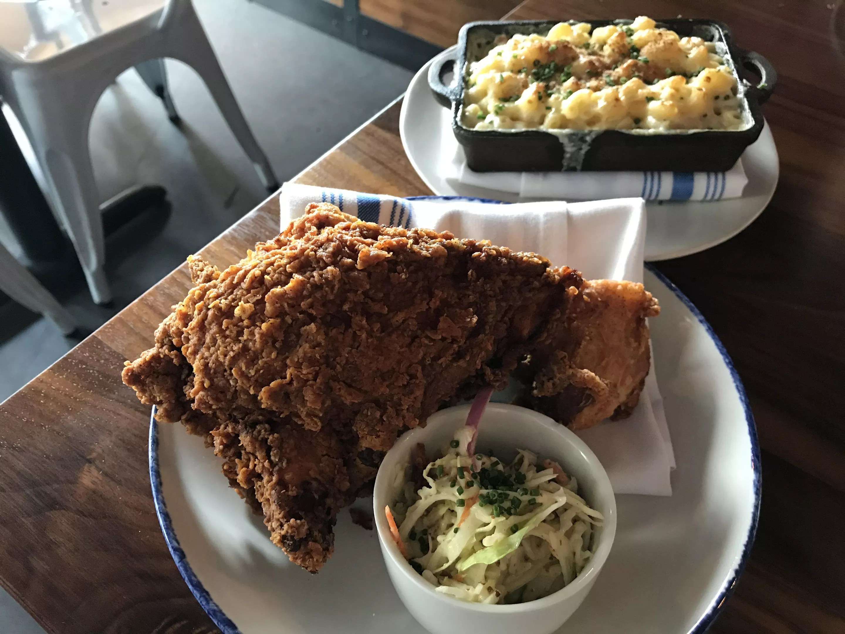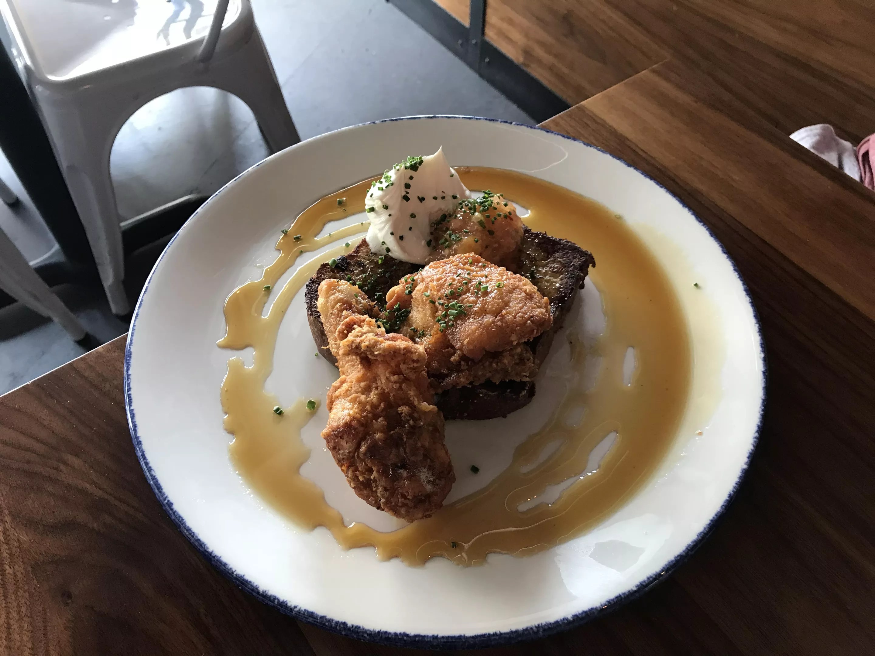 You can order three or six pieces of fried chicken or choose my favorite option: the bucket of chicken and bubbles. You get your choice of a classic Southern side; I chose the mac and cheese, but diners around me seemed to be enjoying the cheesy grits and collard greens with bacon. Low also serves a version of chicken and waffles, with French toast subbing for the waffles. The kitchen then loads the dish with whipped butter, a side of green-tomato jam and smoked maple syrup.