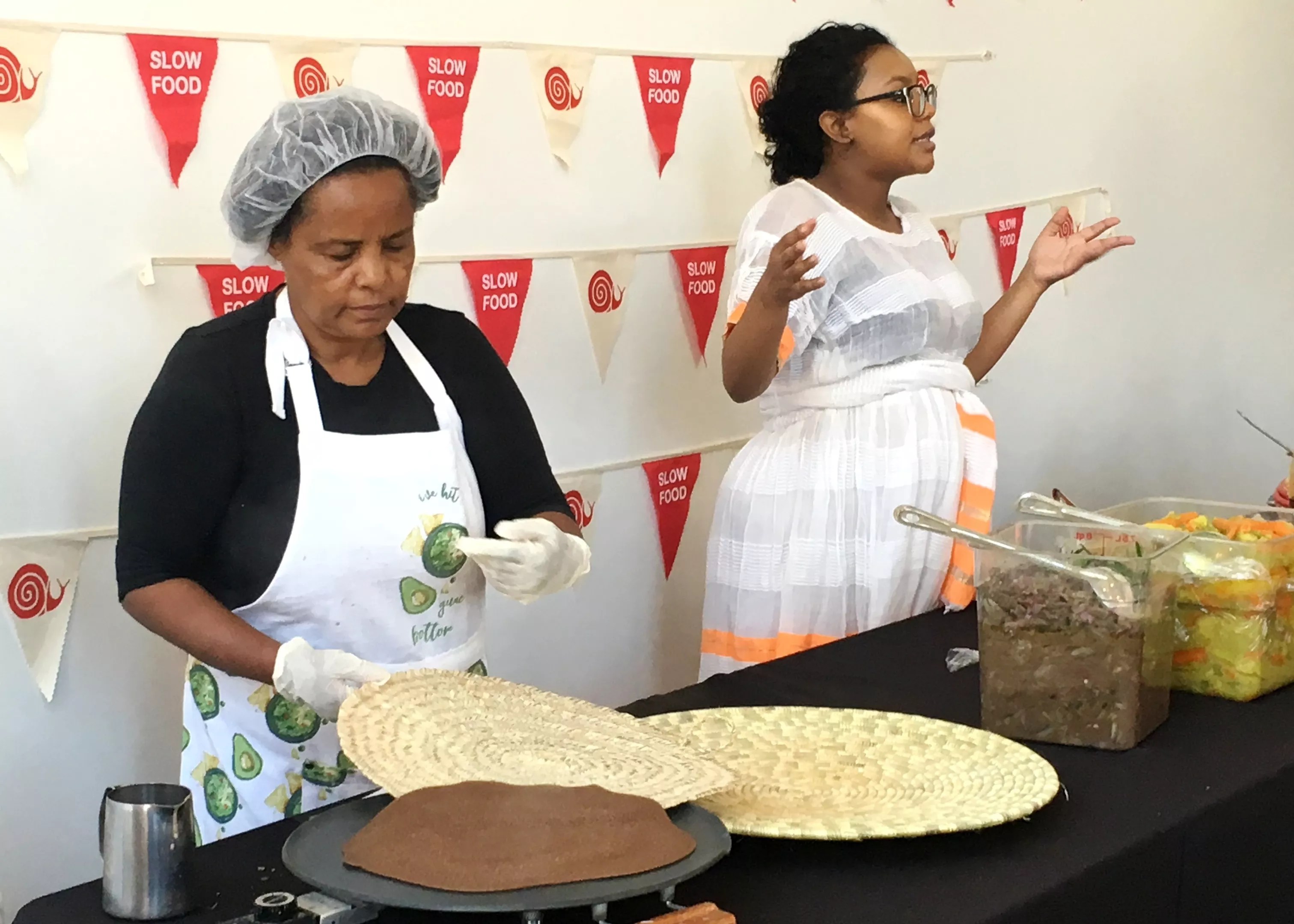 Chef Genet Gebeye and her daughter demonstrate the art of making Ethiopian injera.