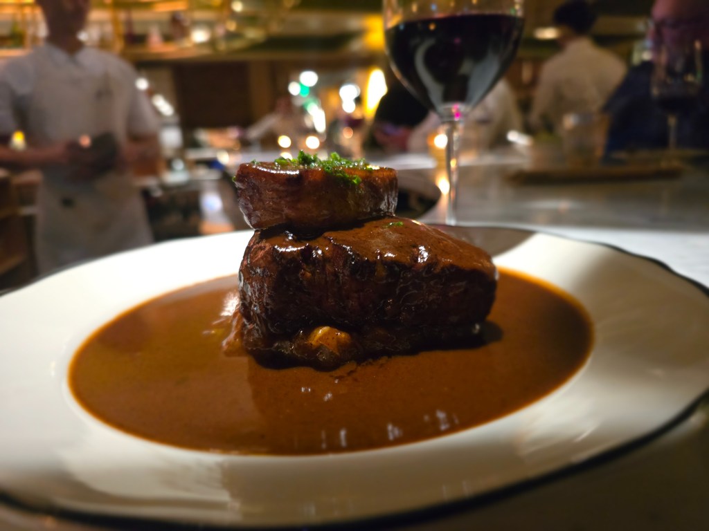 The majority of Mar Bella’s dining room is filled with tables and a large bar, where dishes can be ordered a la carte (small plates average around $21-$28, while larger entrees start at $42). But we opted for the $125 per person, eight-course chef’s counter experience on our first visit, which — spoiler alert! — was a complete pleasure.