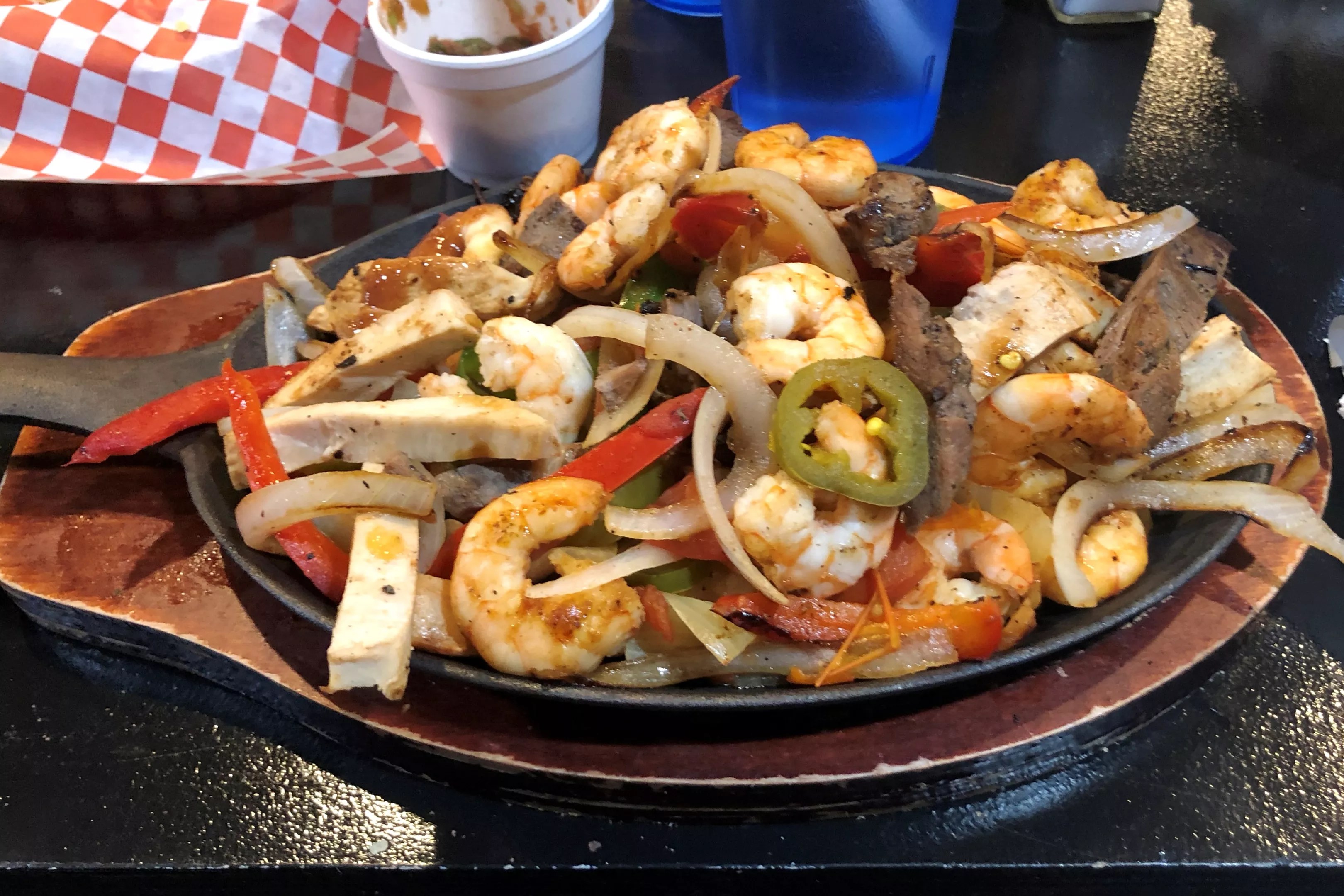 The fajitas mixtas ($17.99) combines tender steak and chicken with whole shrimp; here the meats are piled to overflowing and far more abundant than the grilled peppers and onions that normally overwhelm the proteins at other restaurants. The piña caliente ($14.99), served in a halved, grilled pineapple filled with shrimp and fried pieces of fish, was impressive to look at but was not nearly as tasty as the other dishes. A sharp, Dijon-style mustard sauce drizzled over top was more sweet than caliente and clashed with the already-sweet pineapple. The shrimp were tender, but the pieces of fried fish were extremely dry. Maureen Witten