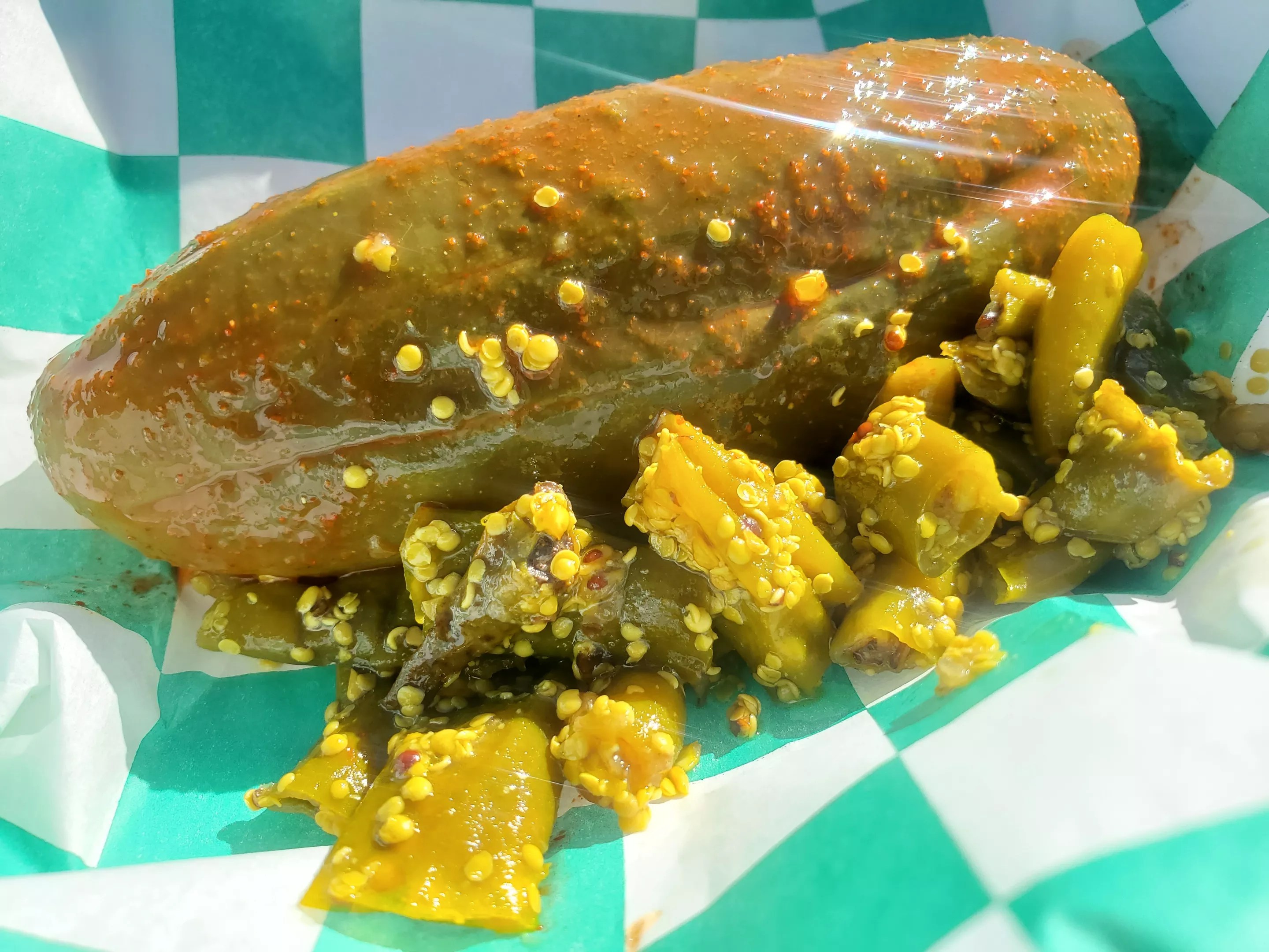 A jumbo chamoy pickle with a side of hot and spicy pickled green chiles.