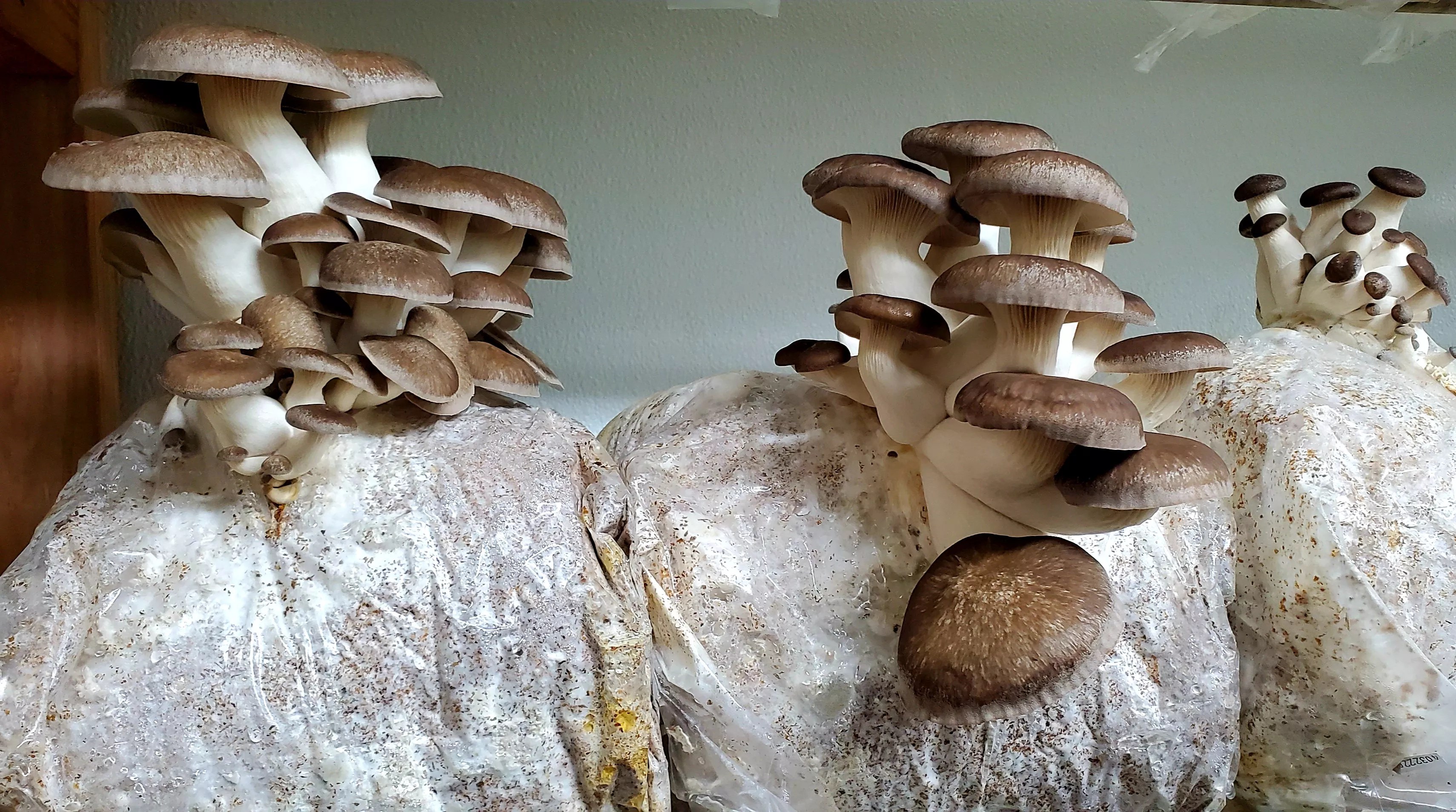 Trumpet mushrooms growing from their bags at Mile High Fungi.