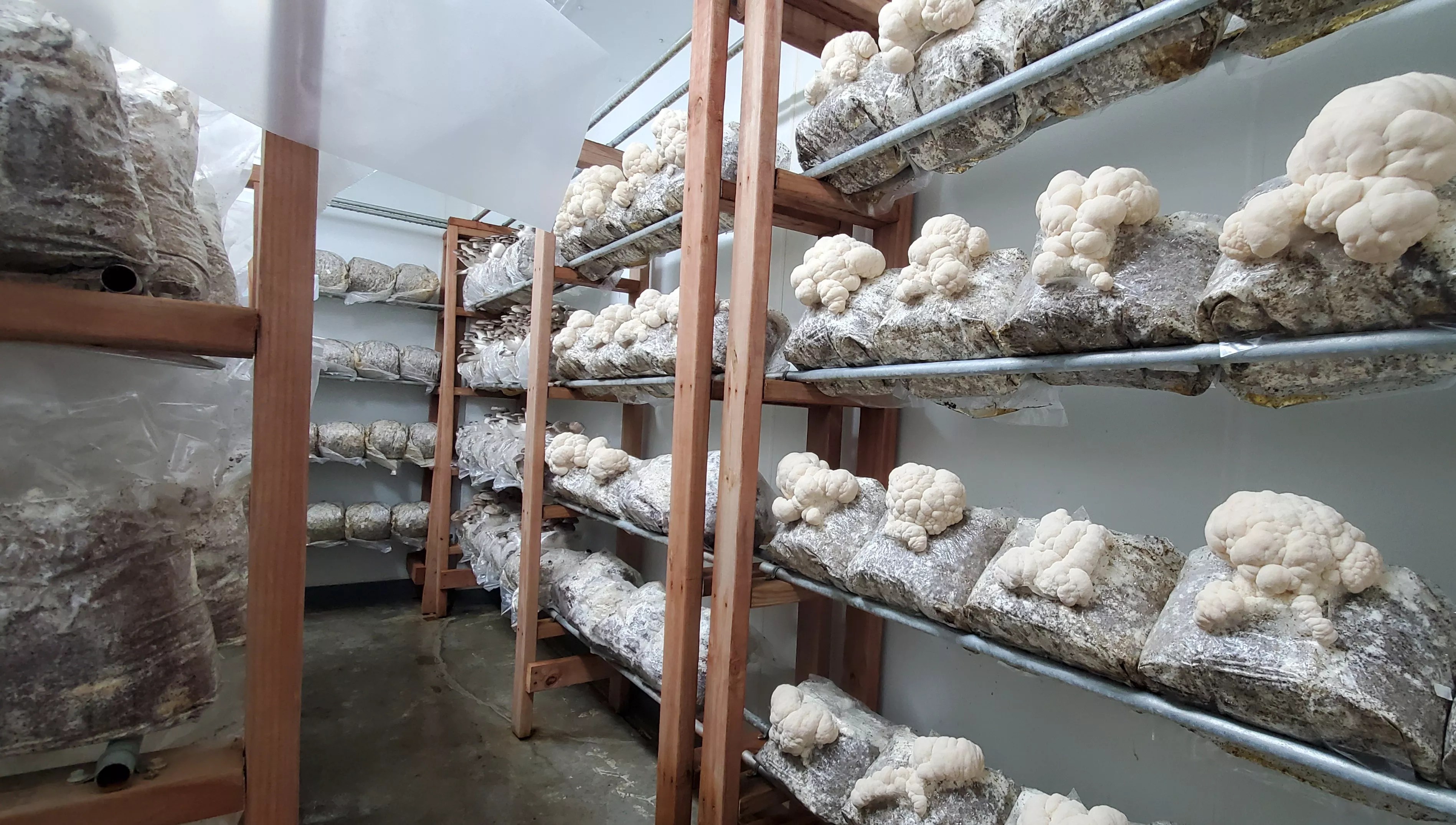 Lion’s mane mushrooms pop up in the farm’s fruiting room.