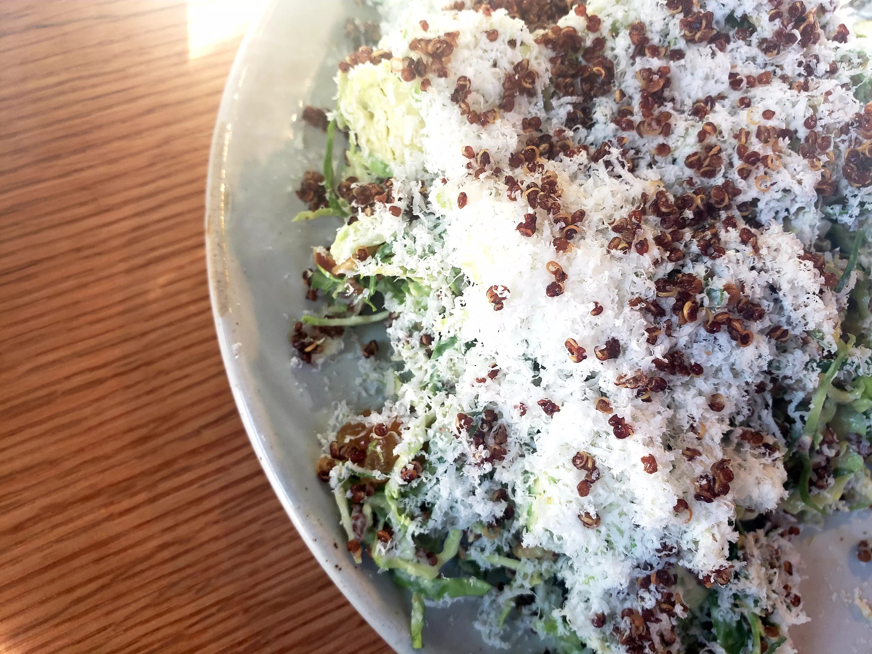Shaved Brussels sprout salad with avocado, quinoa, roasted almond, dried cantaloupe and cotija cheese.