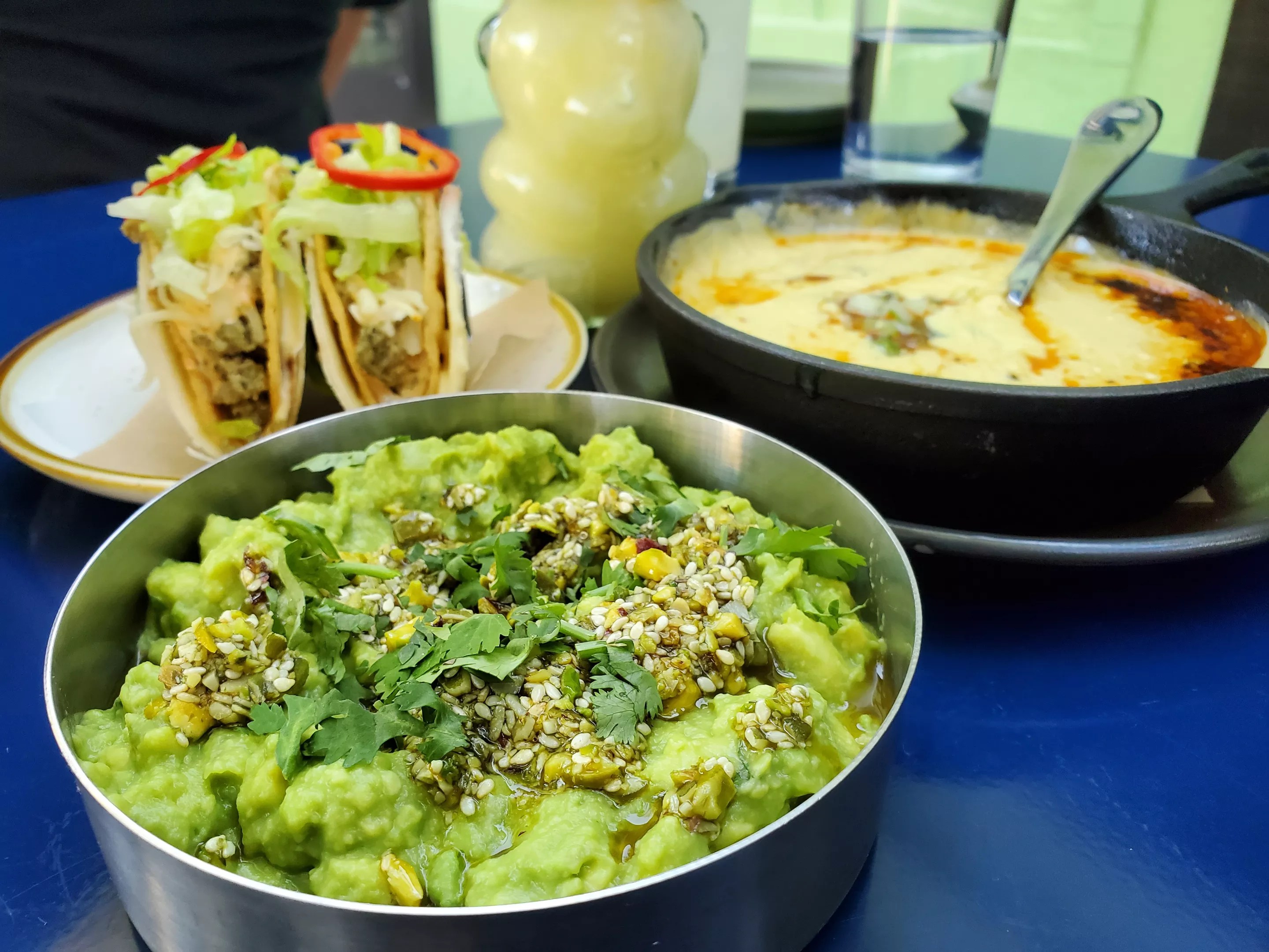 The real fun, though, lies in the food offerings, where even basic dishes get a boost of complex flavors. The guacamole ($11, or $9 during happy hour) is topped with a mix of pumpkin seeds, pistachios and sesame seeds for added crunch and nuttiness. Melted cheese is hard to beat, but a swirl of peanut salsa matcha takes the queso ($11/$6) to new levels of satisfaction. The only thing better than dragging a chip through the creamy cheese is doing the same with one of the small Gordo Crunch happy-hour tacos ($5).