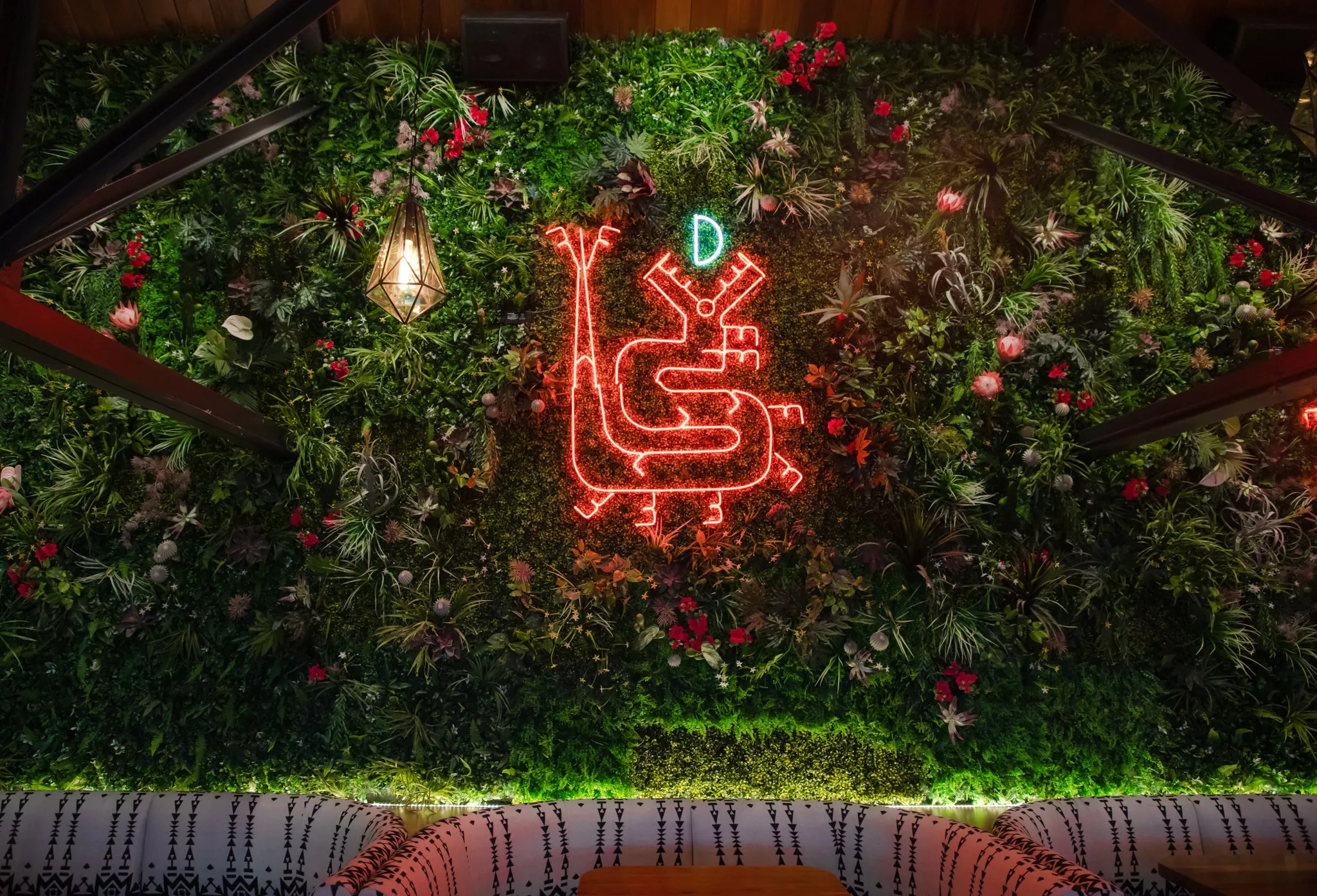 Highlights of the decor include commissioned paintings by Mexican artist Erick Garcia Gomez, a large wall covered in greenery, and 300 lighting fixtures created for the project by Ãtico Decoración in San Miguel de Allende, Mexico, many of which hang through a hole in the floor of the second level that was added to open up the space.
