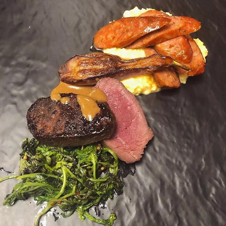Elk steak and sausage with mustard greens and fresh corn polenta.