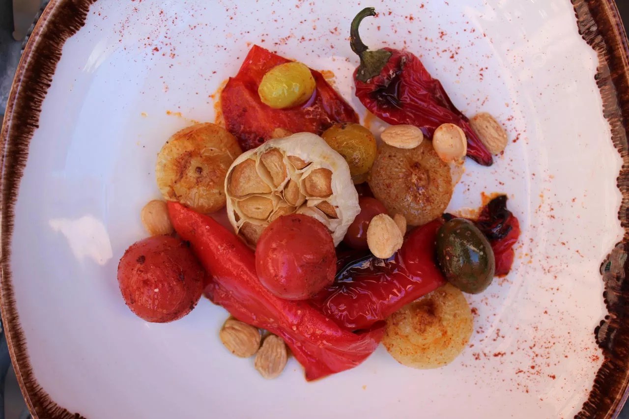 All the ingredients of Spanish romesco sauce on one plate.