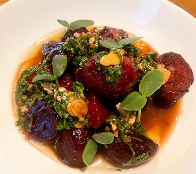 Chinese eatery Hop Alley, which is in the midst of expanding its footprint in RiNo, already added a new vegetable dish to its fall menu: char siu beets. These roasted baby beets are charred on the wood fire, glazed with a beet juice char siu sauce, and topped with a relish of beet greens, cashews, sesame and red verjus.
