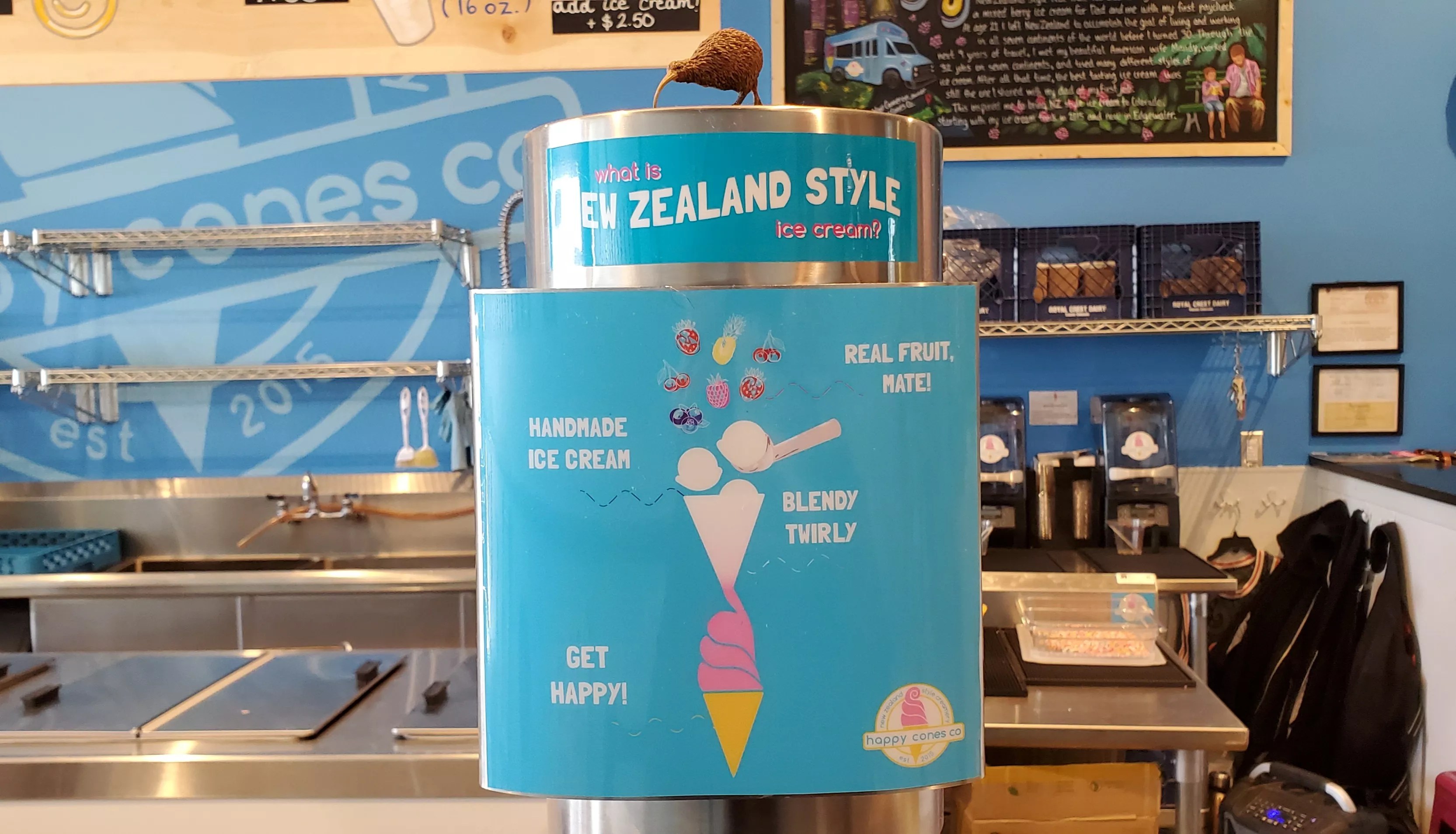 The 38-year-old New Zealand native came up with the idea for Happy Cones after a stint picking berries on a farm near his house in Nelson, New Zealand. The farm had a machine that would turn fresh fruit and an ice cream base into a sweet dessert on demand.