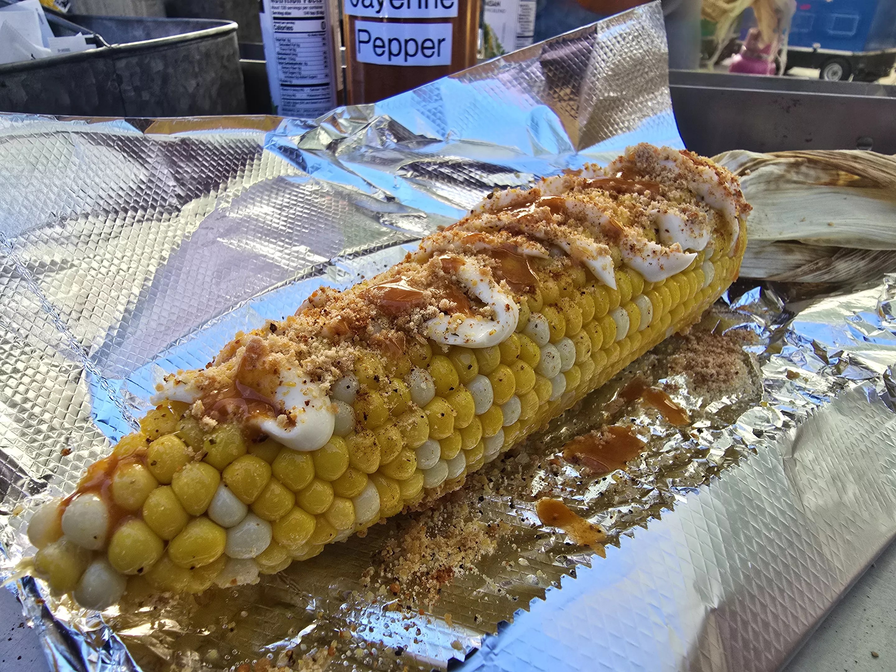 That stand is also where you can — and should — order a cob of roasted corn, which you can load up with mayo, seasonings and hot sauce at the condiment table.