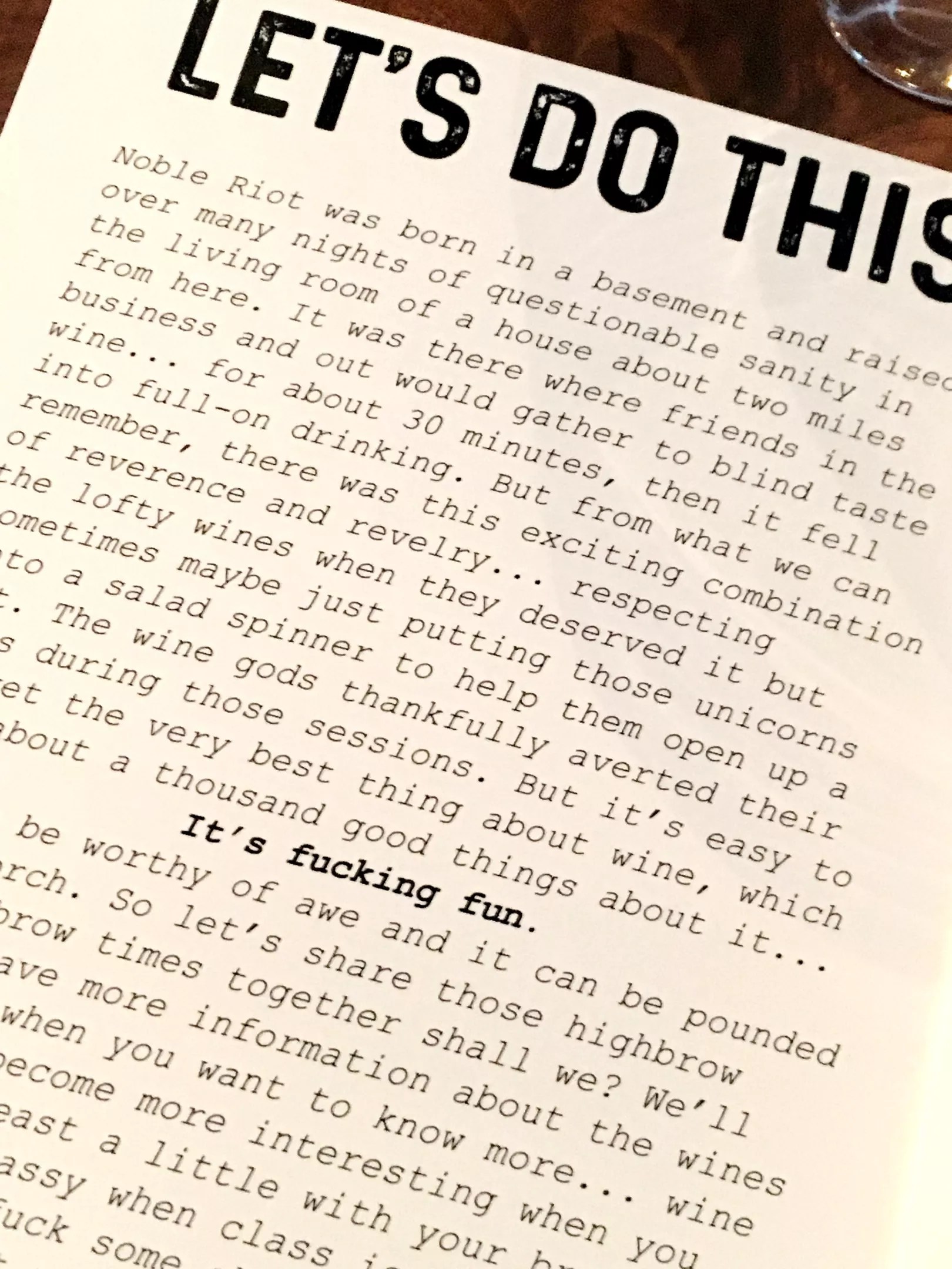 Nocturne owners Nicole and Scott Mattson, along with wine veterans Joel Kampfe and Troy Bowen, have assembled a lineup of intriguing natural wines, along with a supporting cast of small plates and cocktails, in the intimate bar space that was previously Greenlight Lab. Brighter paint, white tile behind the bar and raucous music welcome wine lovers or the wine-curious, who are immediately set at ease with a menu that boldly proclaims the best thing about drinking wine is that “It’s fucking fun.”