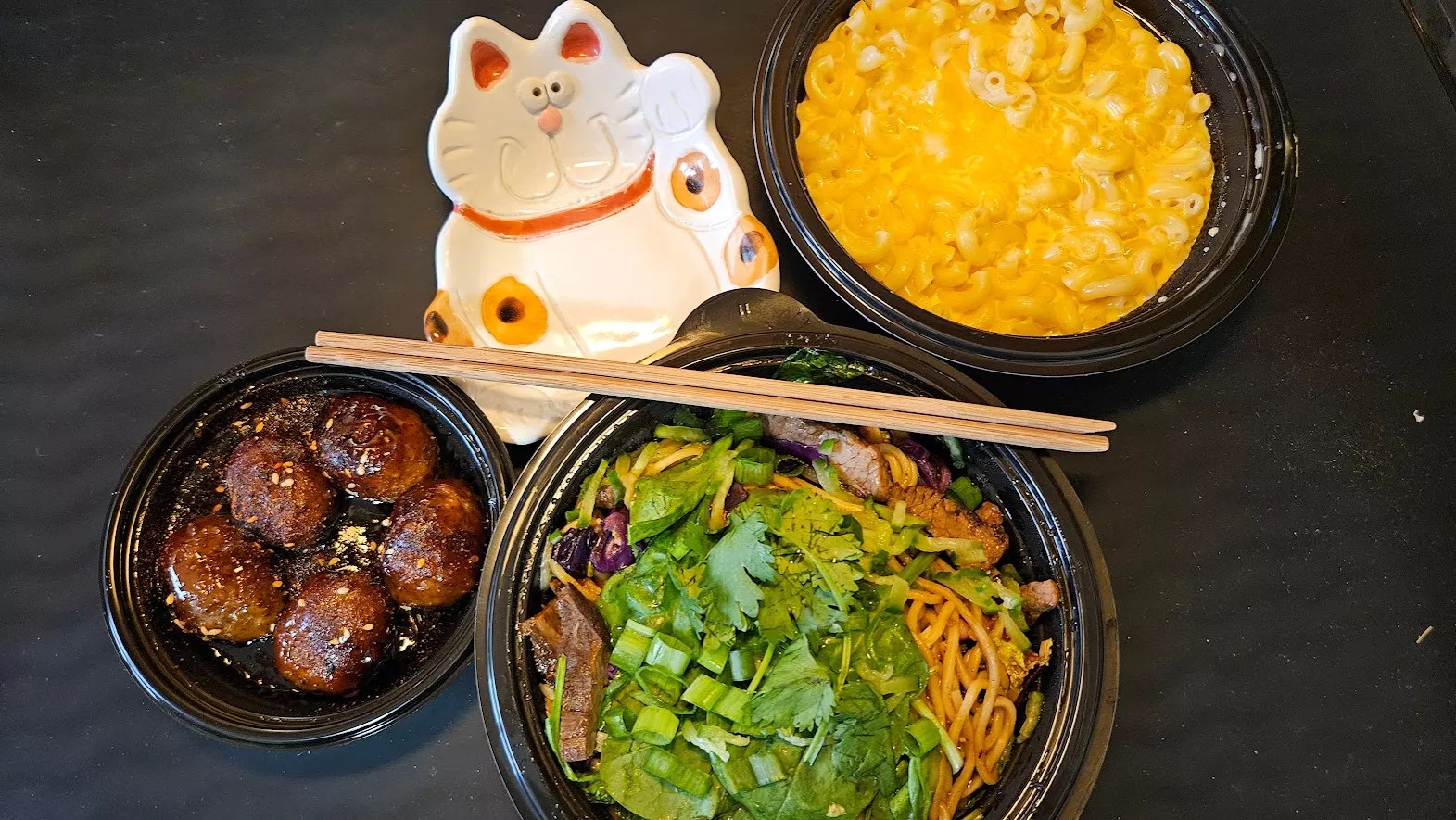 Take-home payload: Spicy Korean Steak Noodles, Mac & Cheese and Asian-marinated meatballs, which diners order to eat with Mac & Cheese.